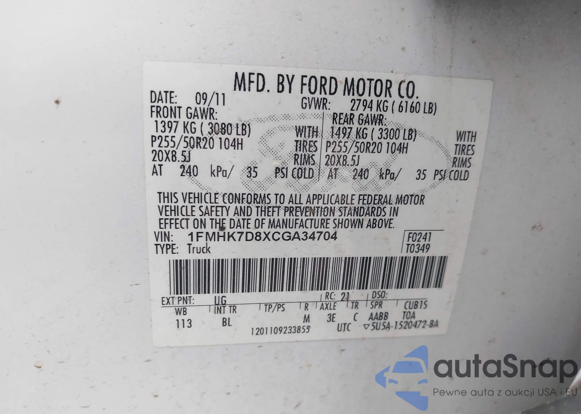LOT: 42684998 VIN: 2FMPK3K94HBC30782
