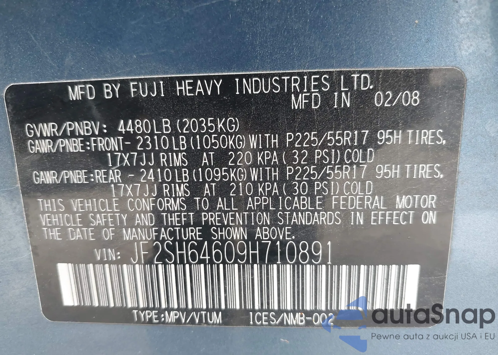 • VIN JF2SH64609H710891