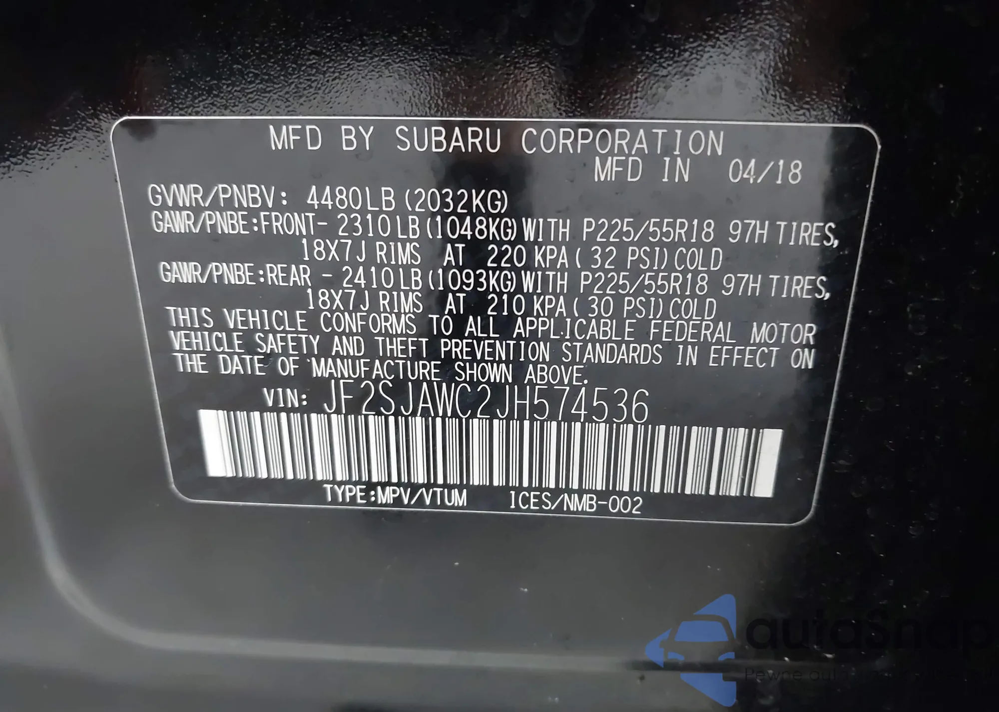 • VIN JF2SJAWC2JH574536