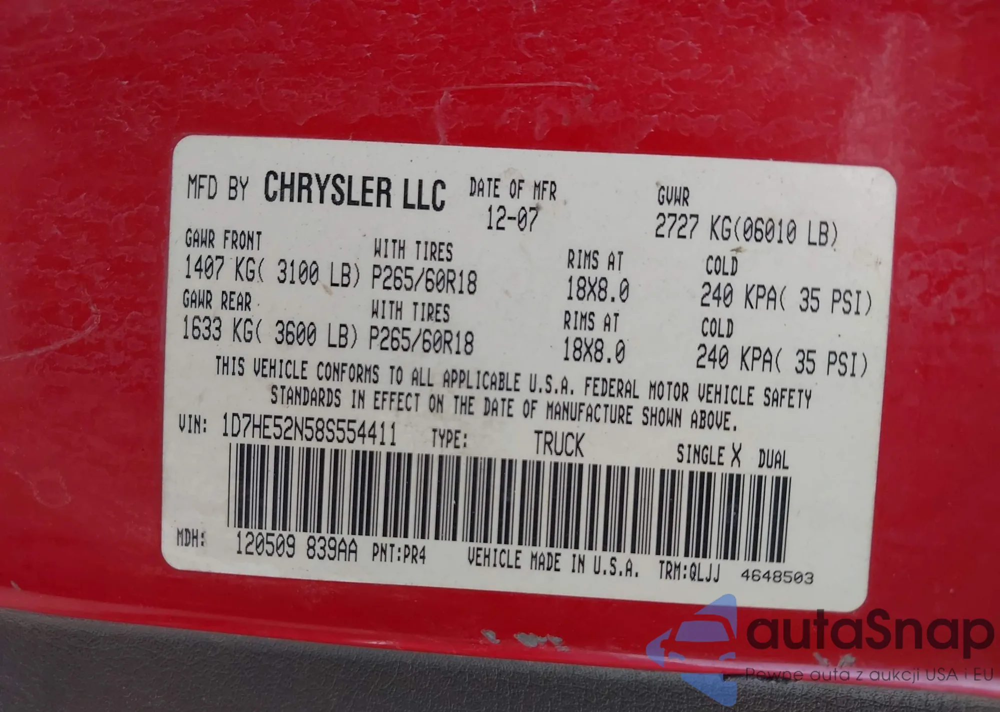 LOT: 42913571 VIN: 1D7HE52N58S554411
