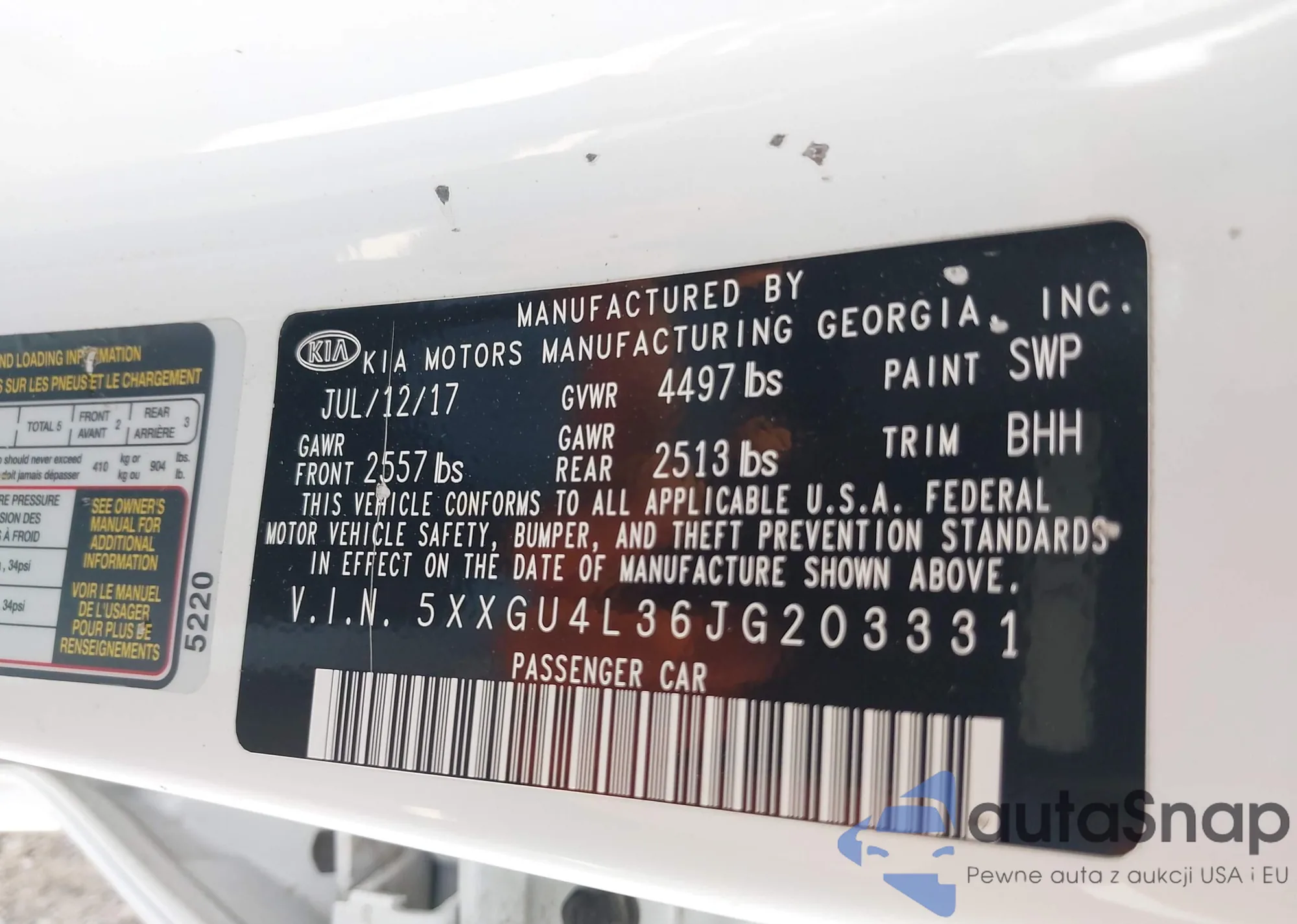 • VIN 5XXGU4L36JG203331