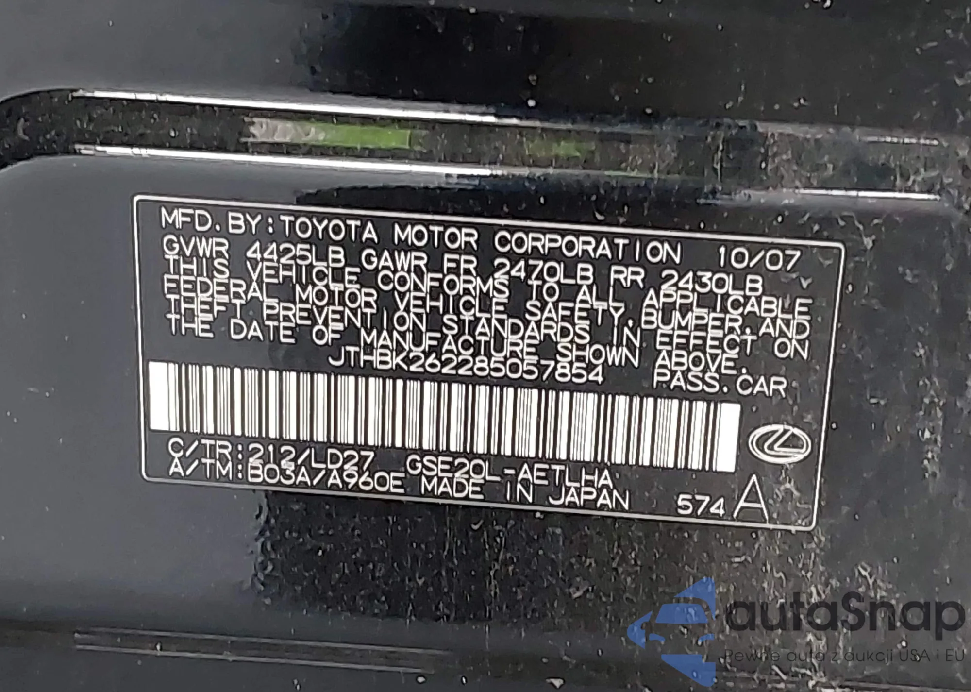 LOT: 42239712 VIN: JTHBK262285057854