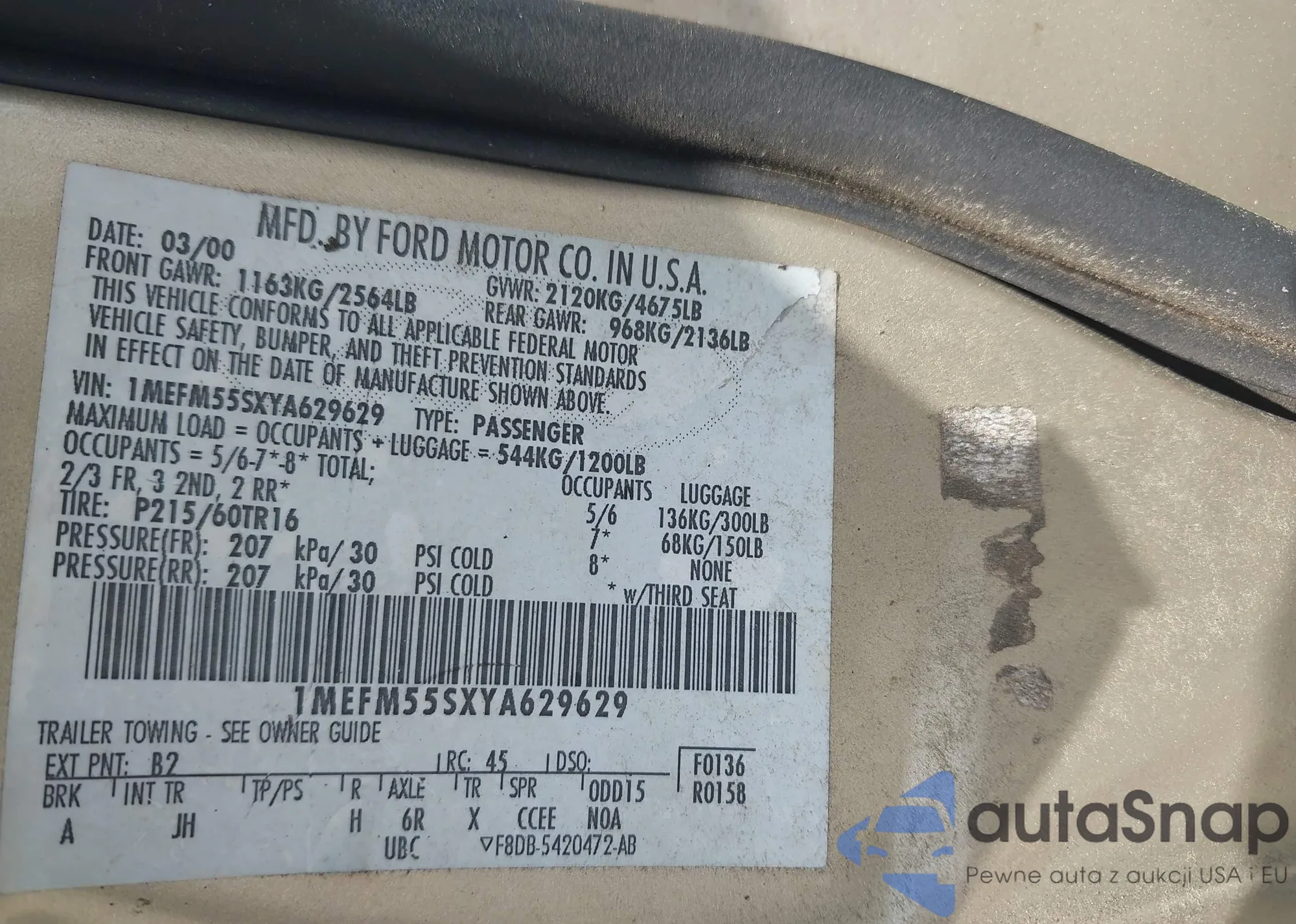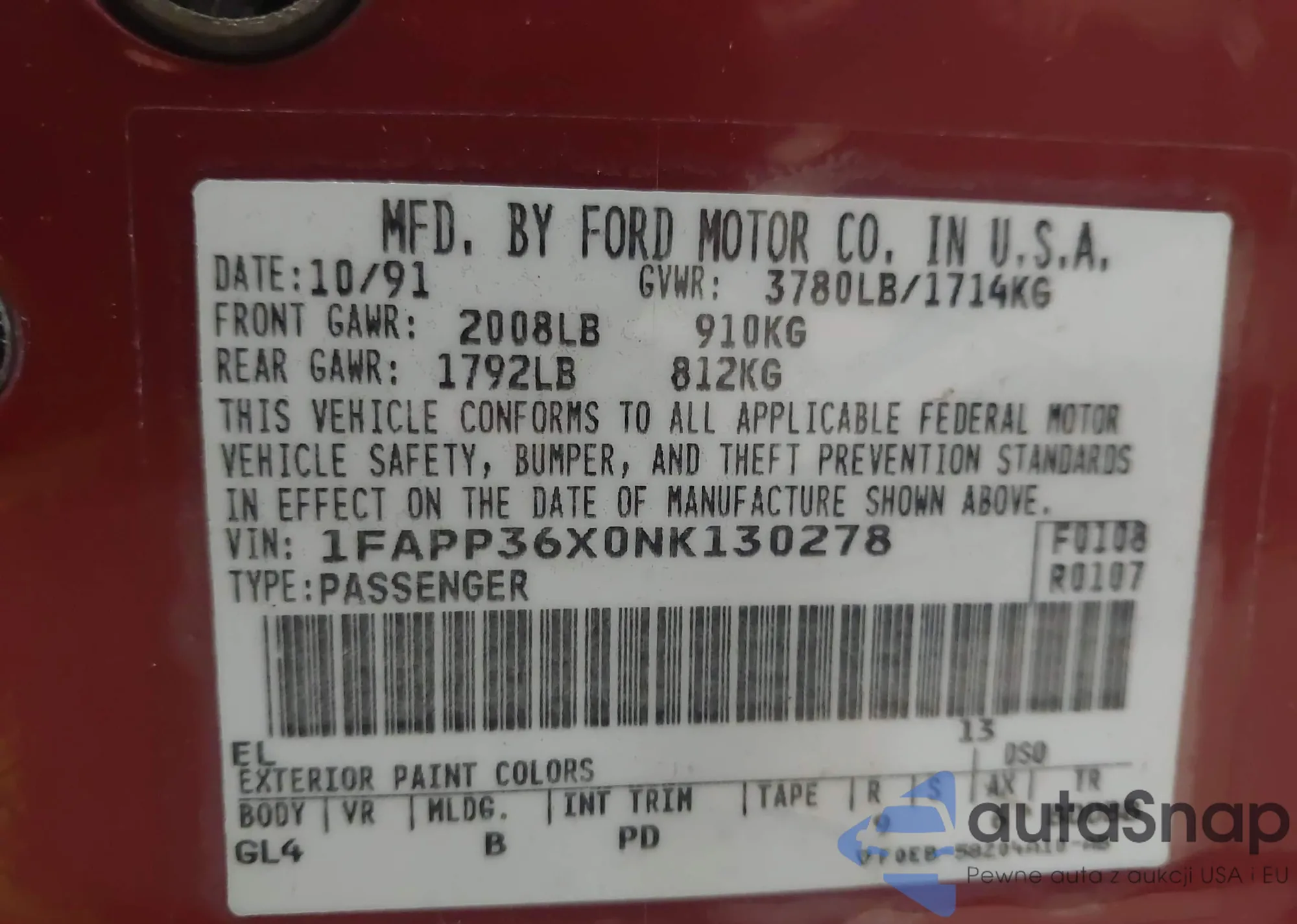 LOT: 42926859 VIN: 1FAPP36X0NK130278