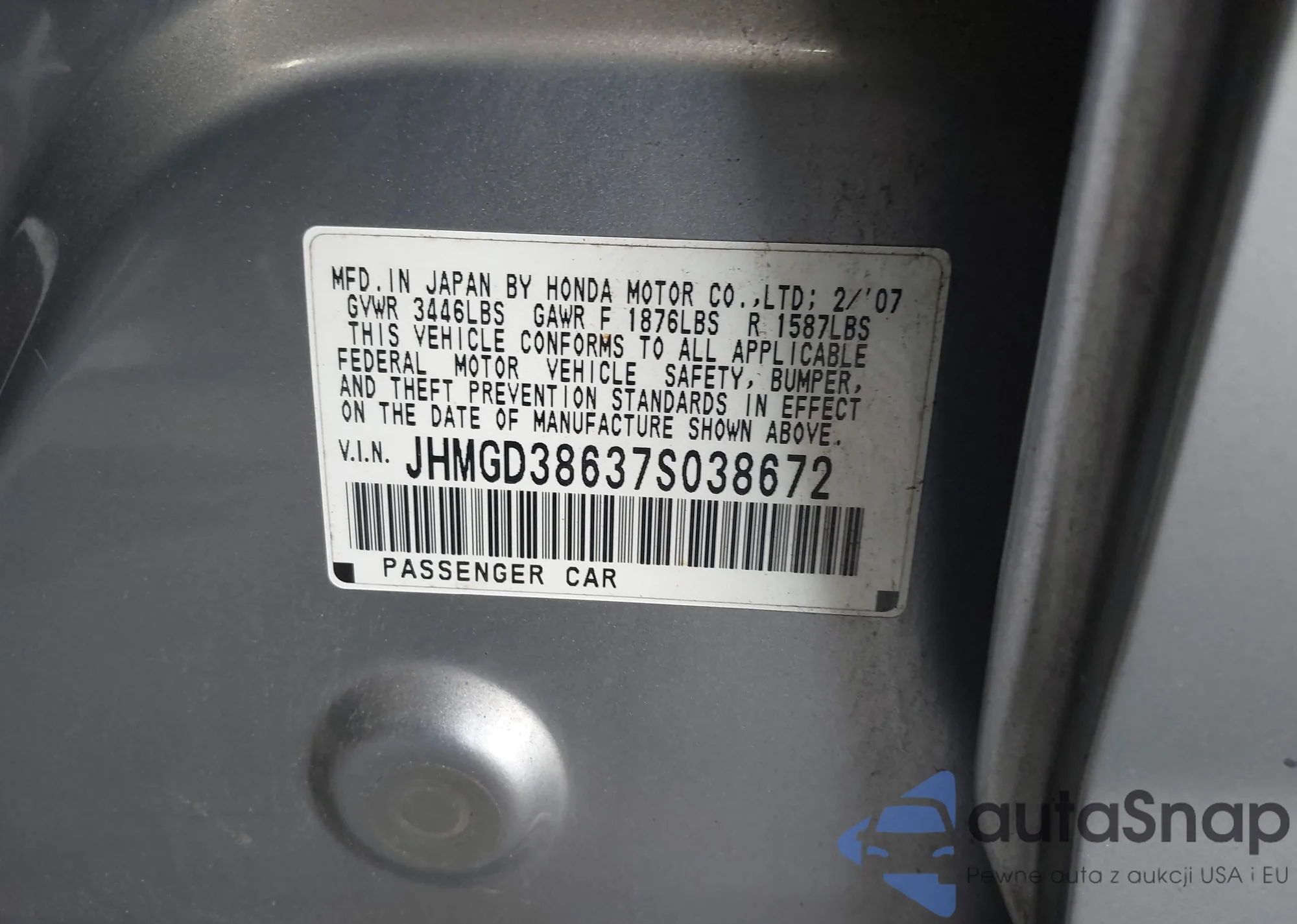 LOT: 42743258 VIN: JHMGD38637S038672