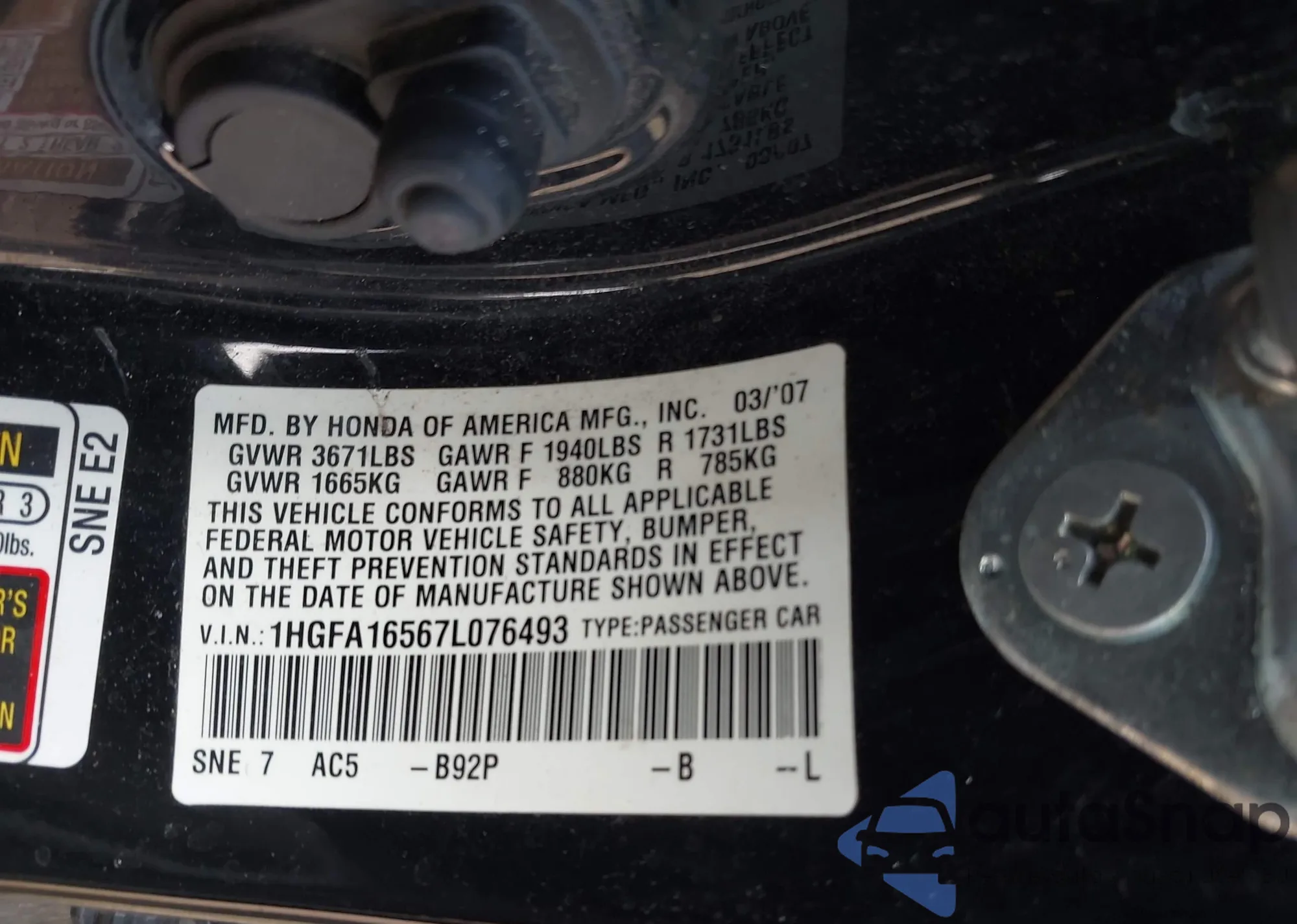 LOT: 42696452 VIN: 1HGFA16567L076493