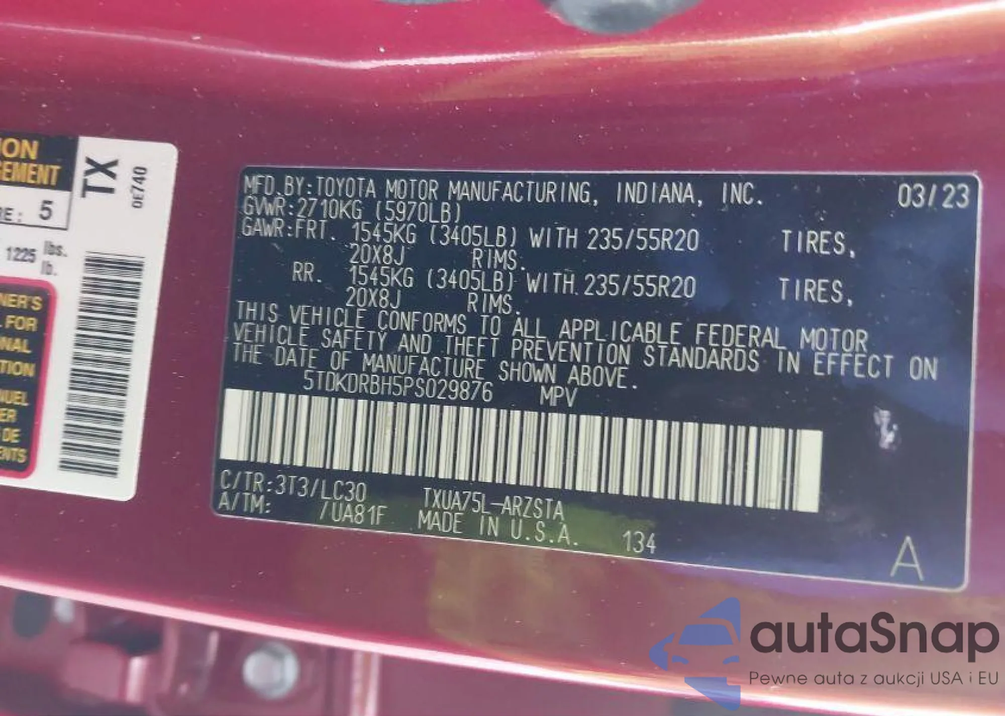 LOT: 42913282 VIN: 5TDKDRBH5PS029876