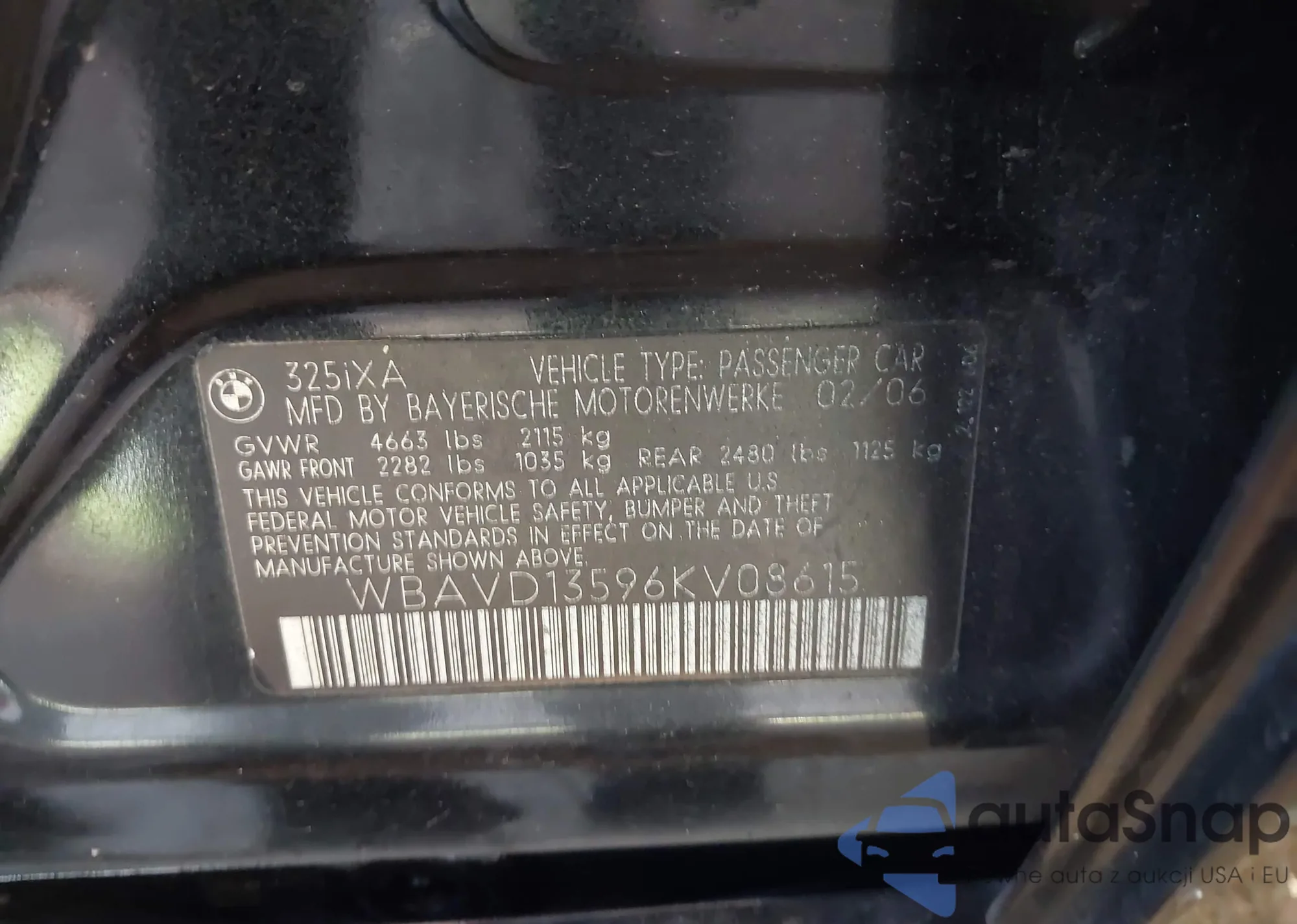 2006 BMW 325Xi z USA, uszkodzony, nr VIN WBAVD13596KV08615