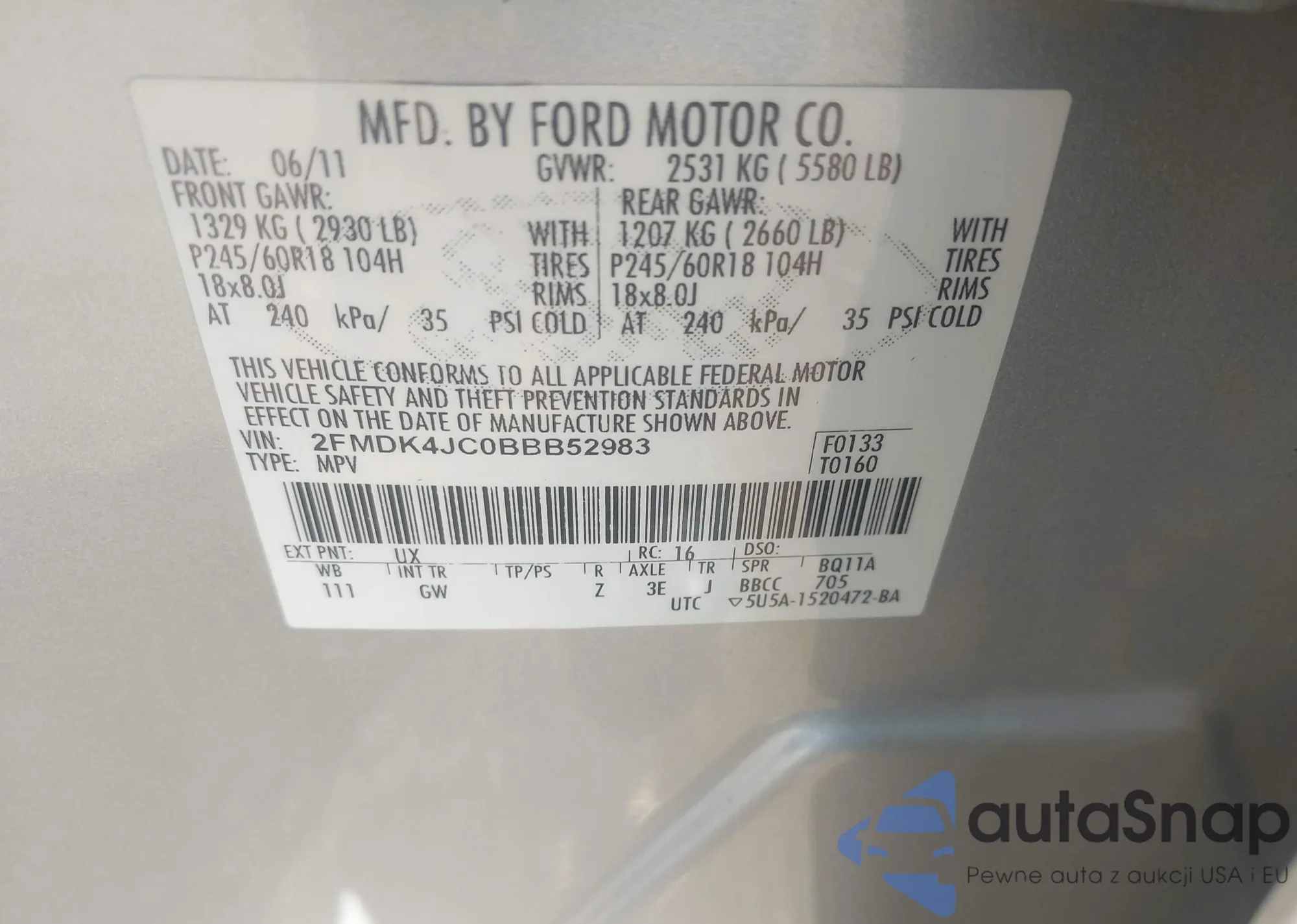 LOT: 42791200 VIN: 2FMDK4JC0BBB52983