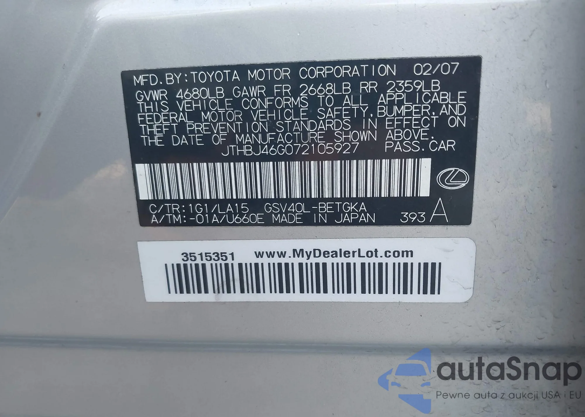 LOT: 42833280 VIN: JTHBJ46G072105927
