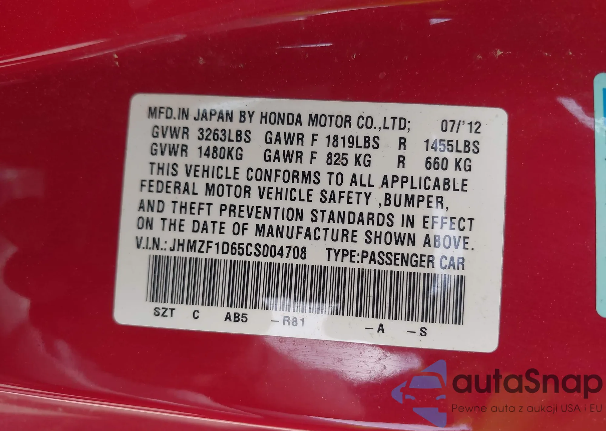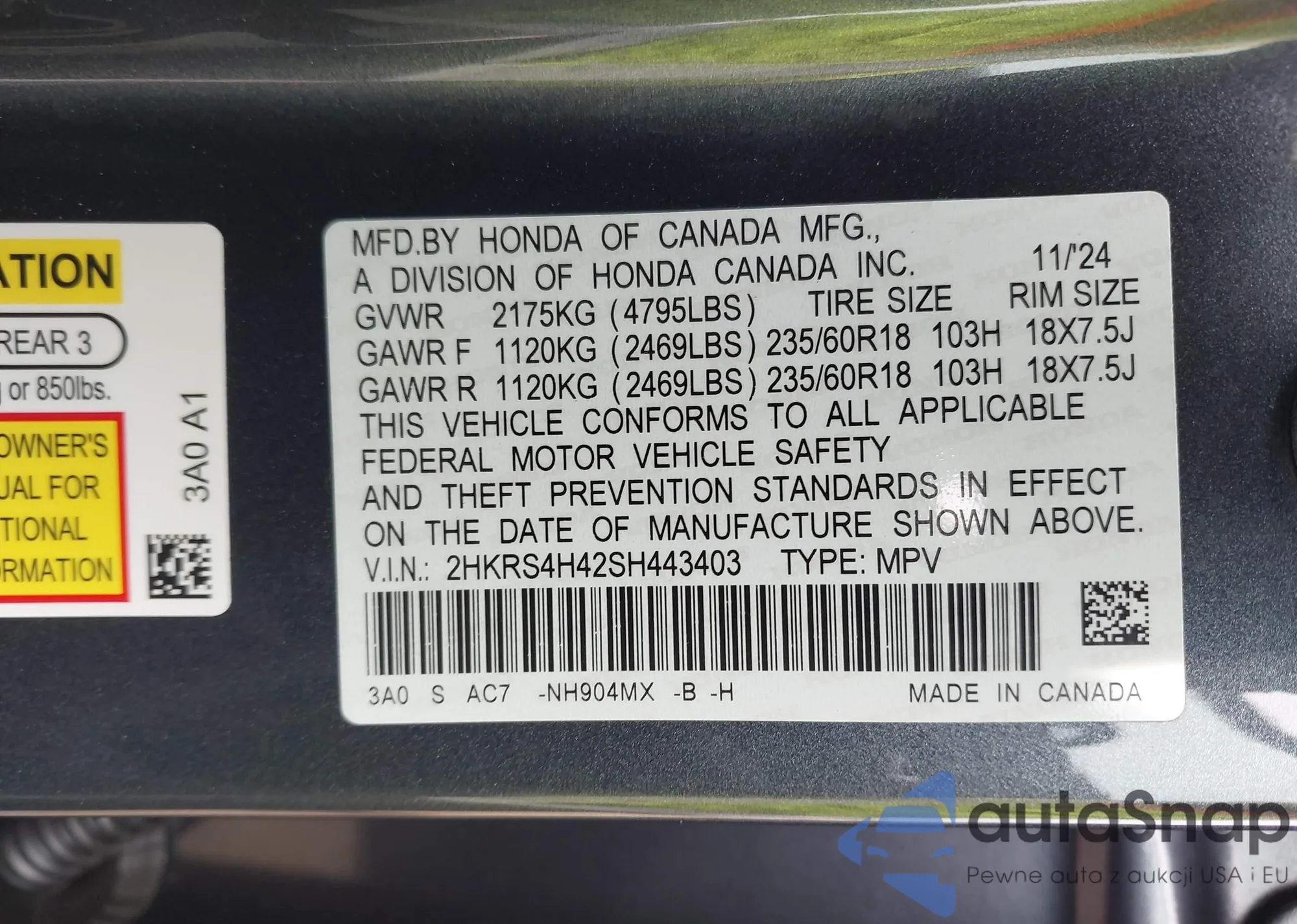 • VIN 2HKRS4H42SH443403