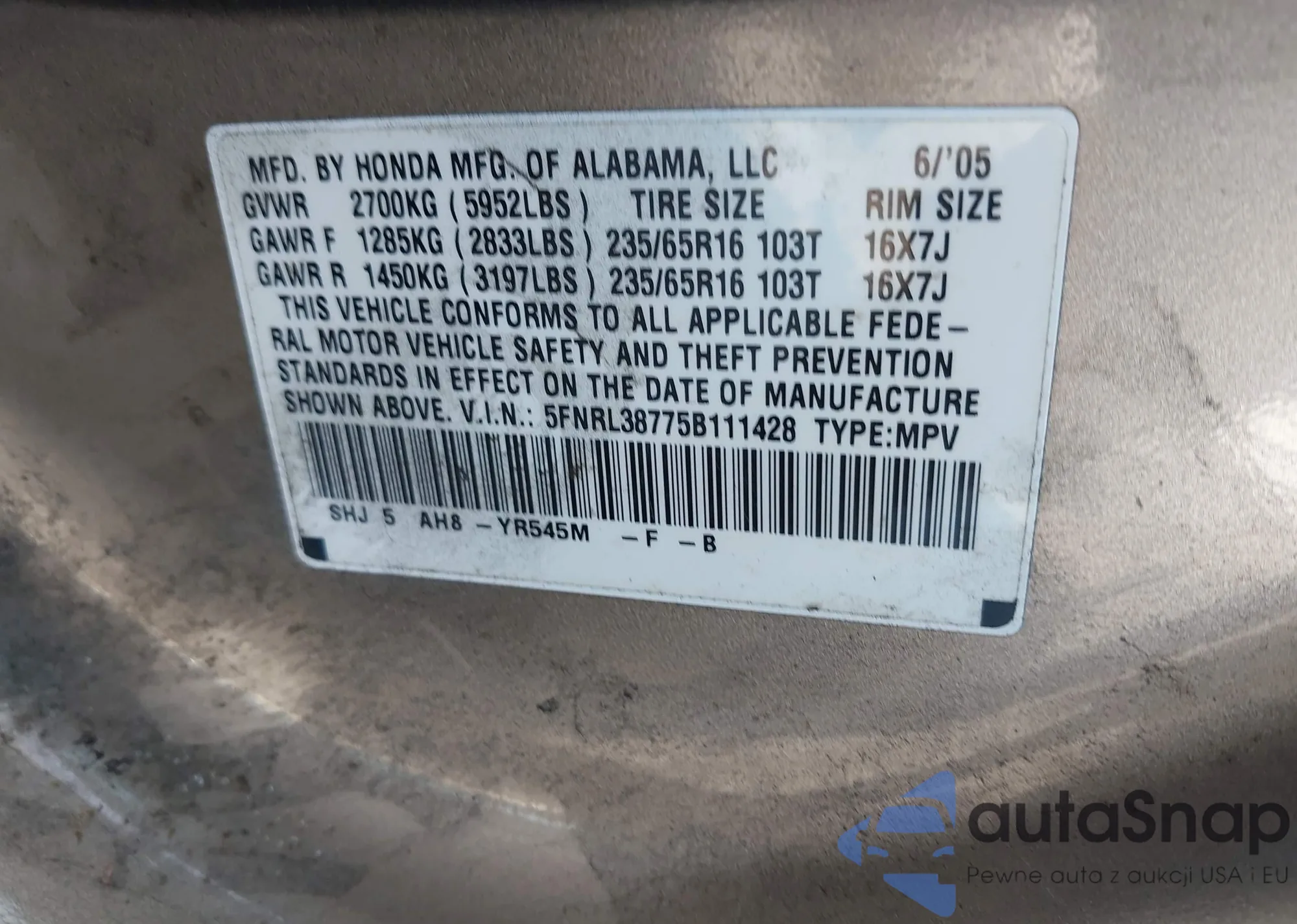 LOT: 42907991 VIN: 5FNRL38775B111428
