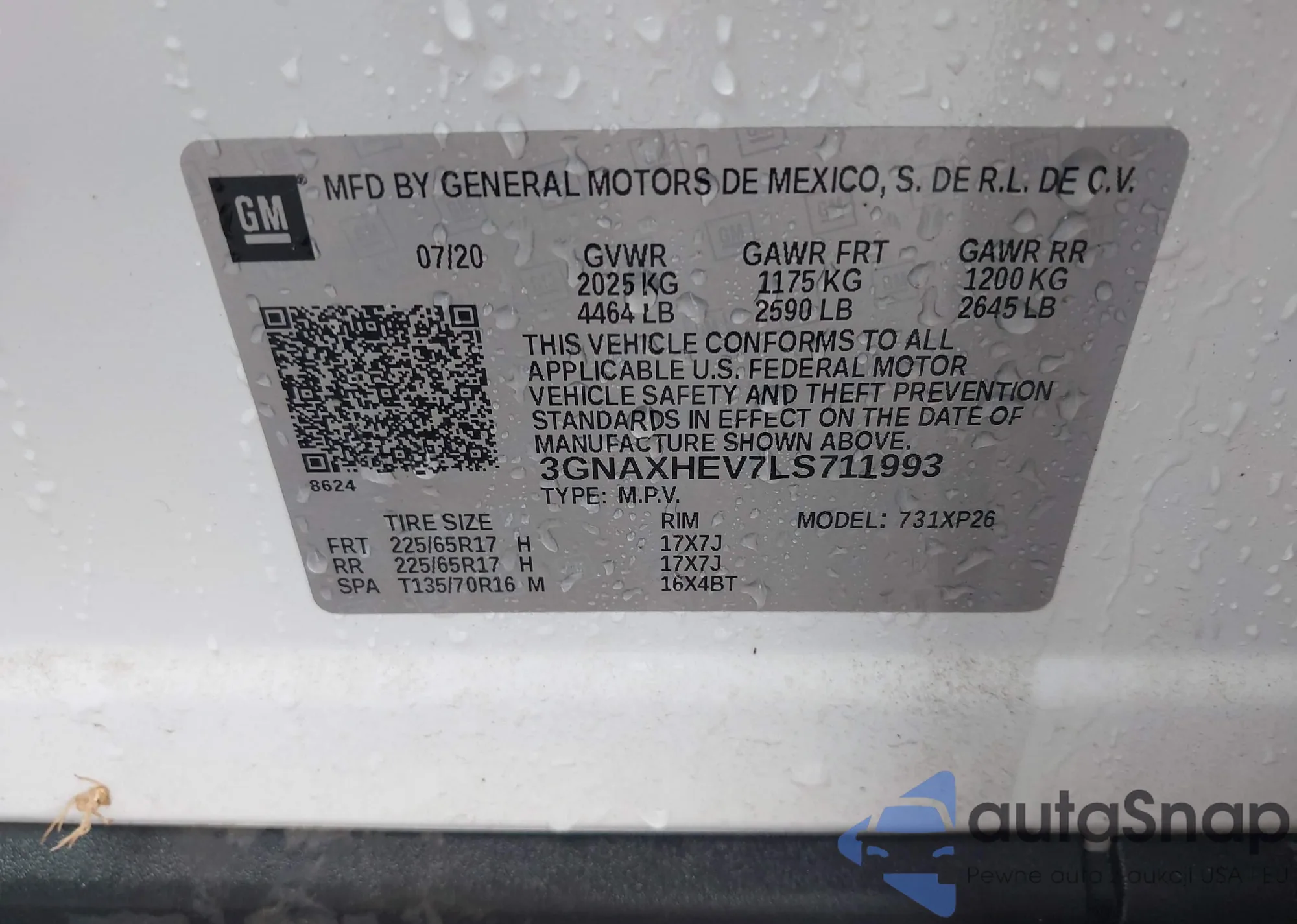 LOT: 42684017 VIN: 3GNAXHEV7LS711993