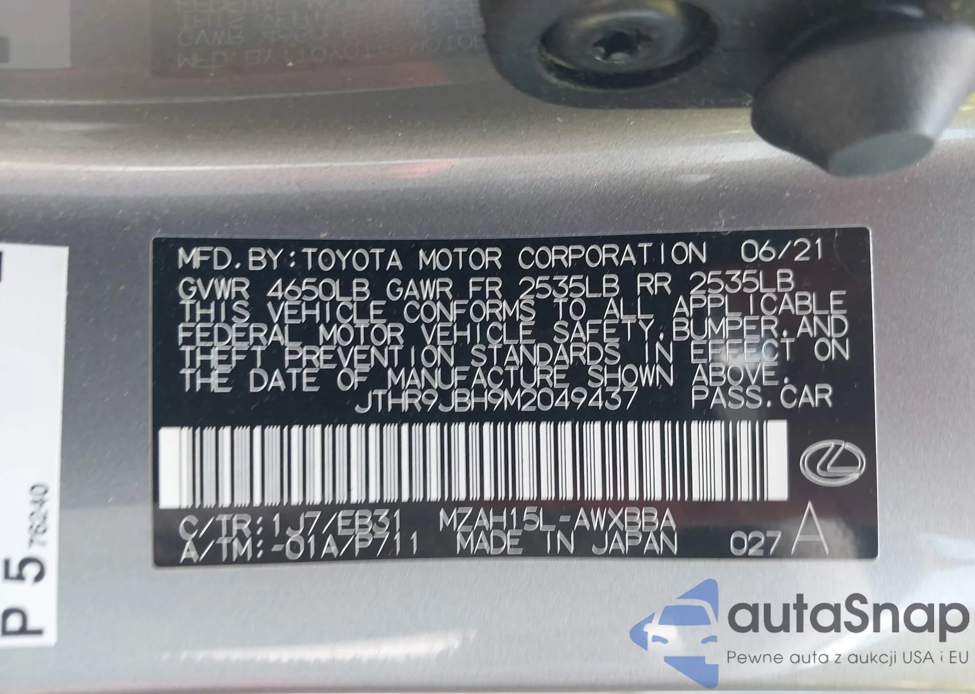 LOT: 42694536 VIN: JTHR9JBH9M2049437