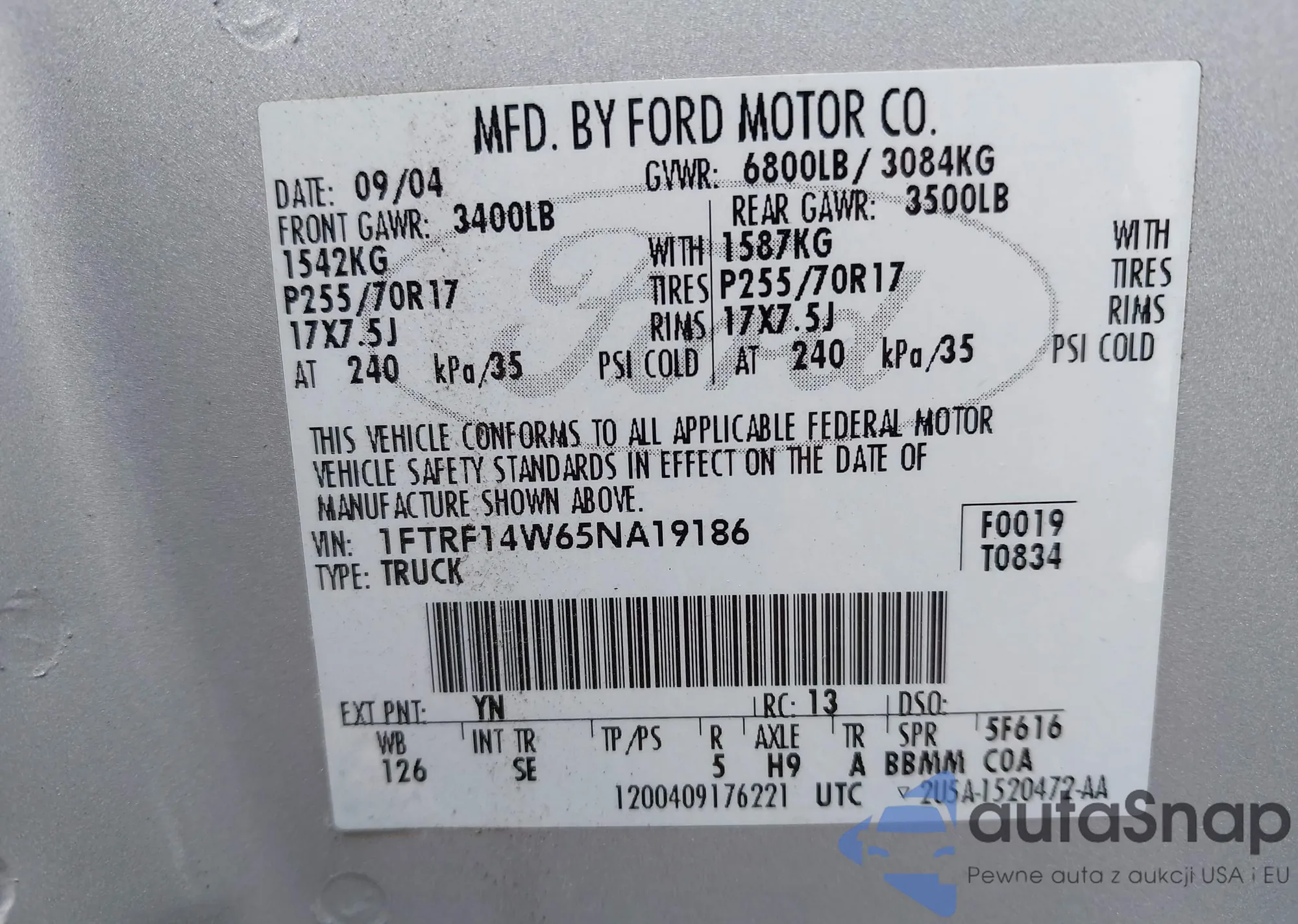 LOT: 42731590 VIN: 1FTRF14W65NA19186
