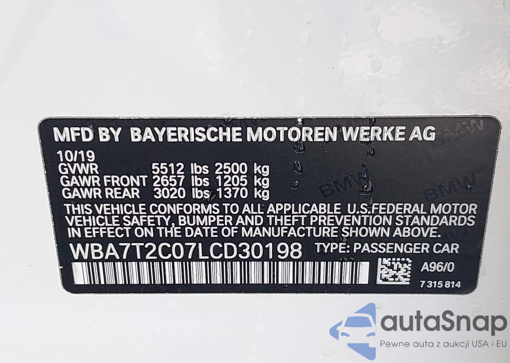LOT: 41524691 VIN: WBA7T2C07LCD30198