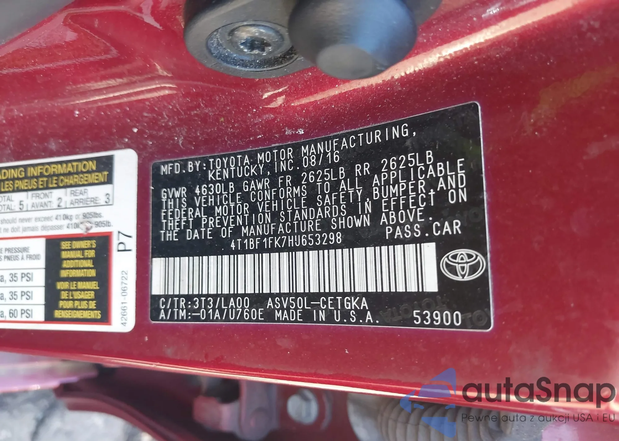 • VIN 4T1BF1FK7HU653298
