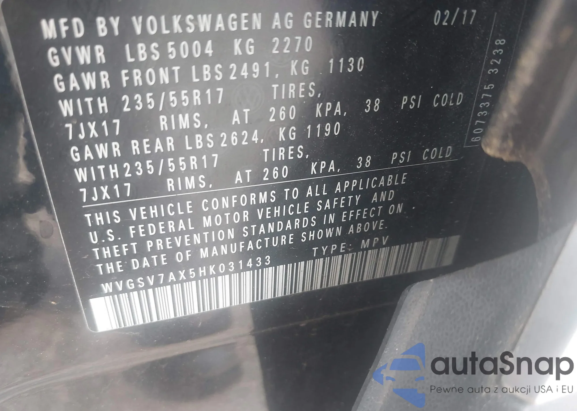 • VIN WVGSV7AX5HK031433