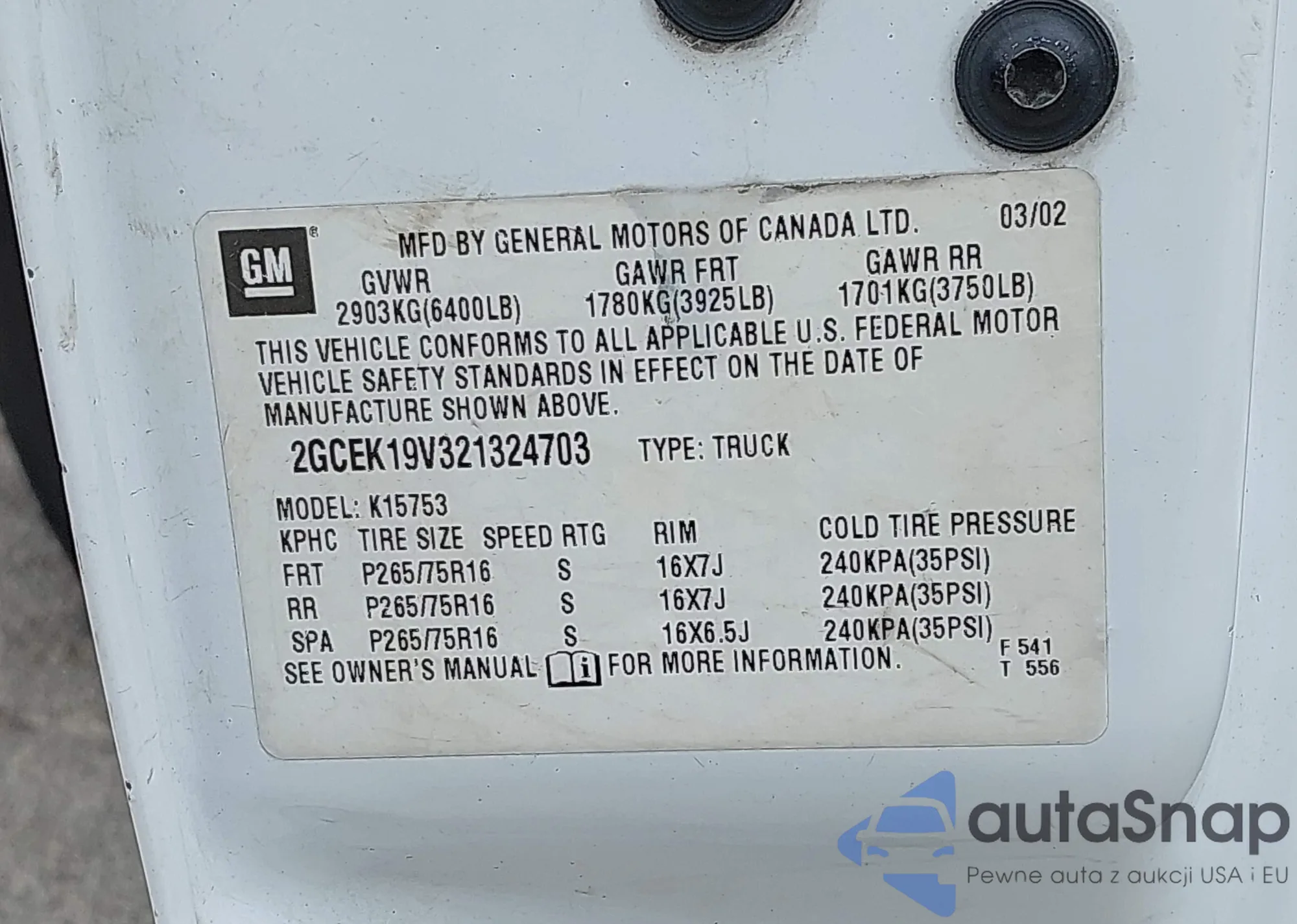 • VIN 2GCEK19V321324703