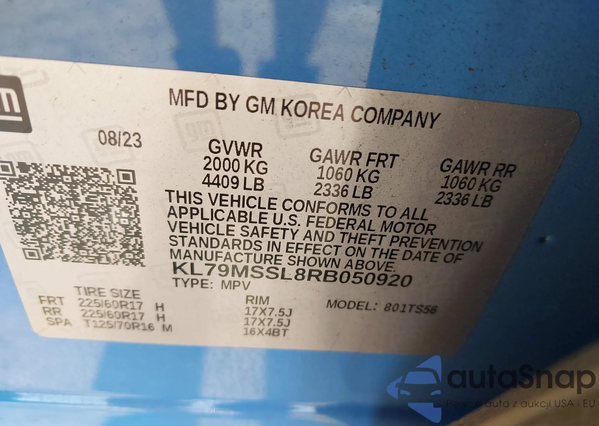 • VIN KL79MSSL8RB050920