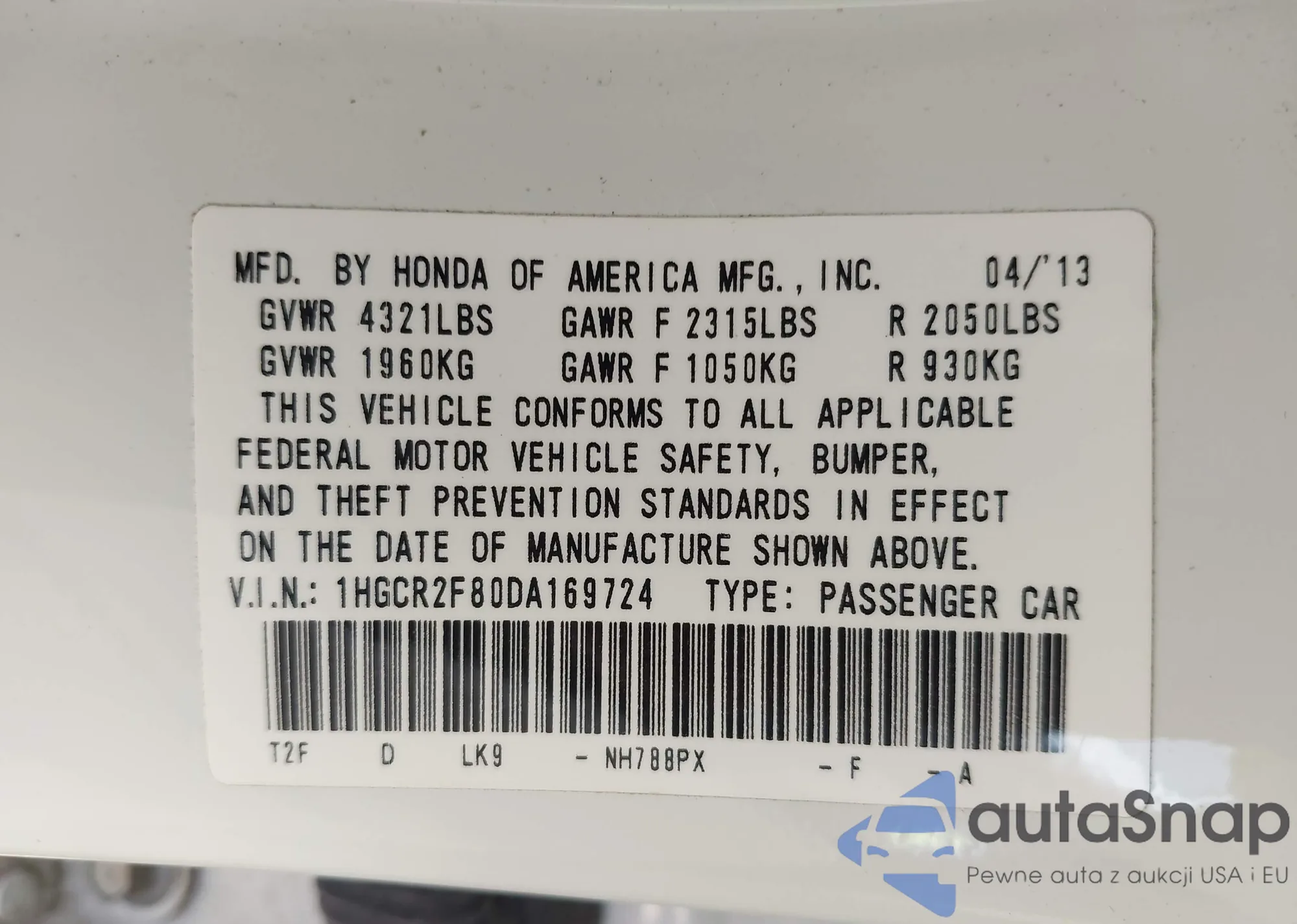 • VIN 1HGCR2F80DA169724