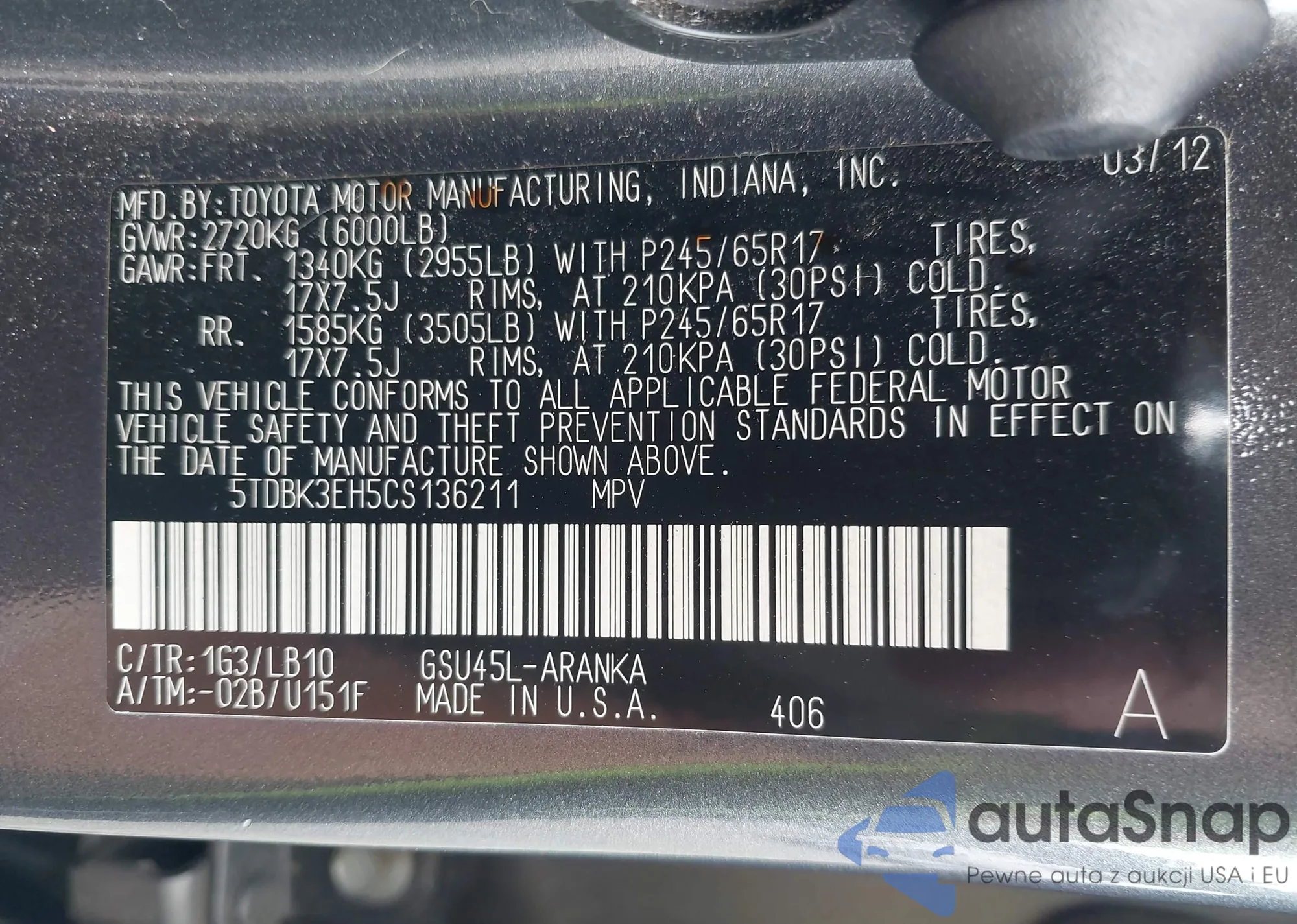 LOT: 42748465 VIN: 5TDBK3EH5CS136211