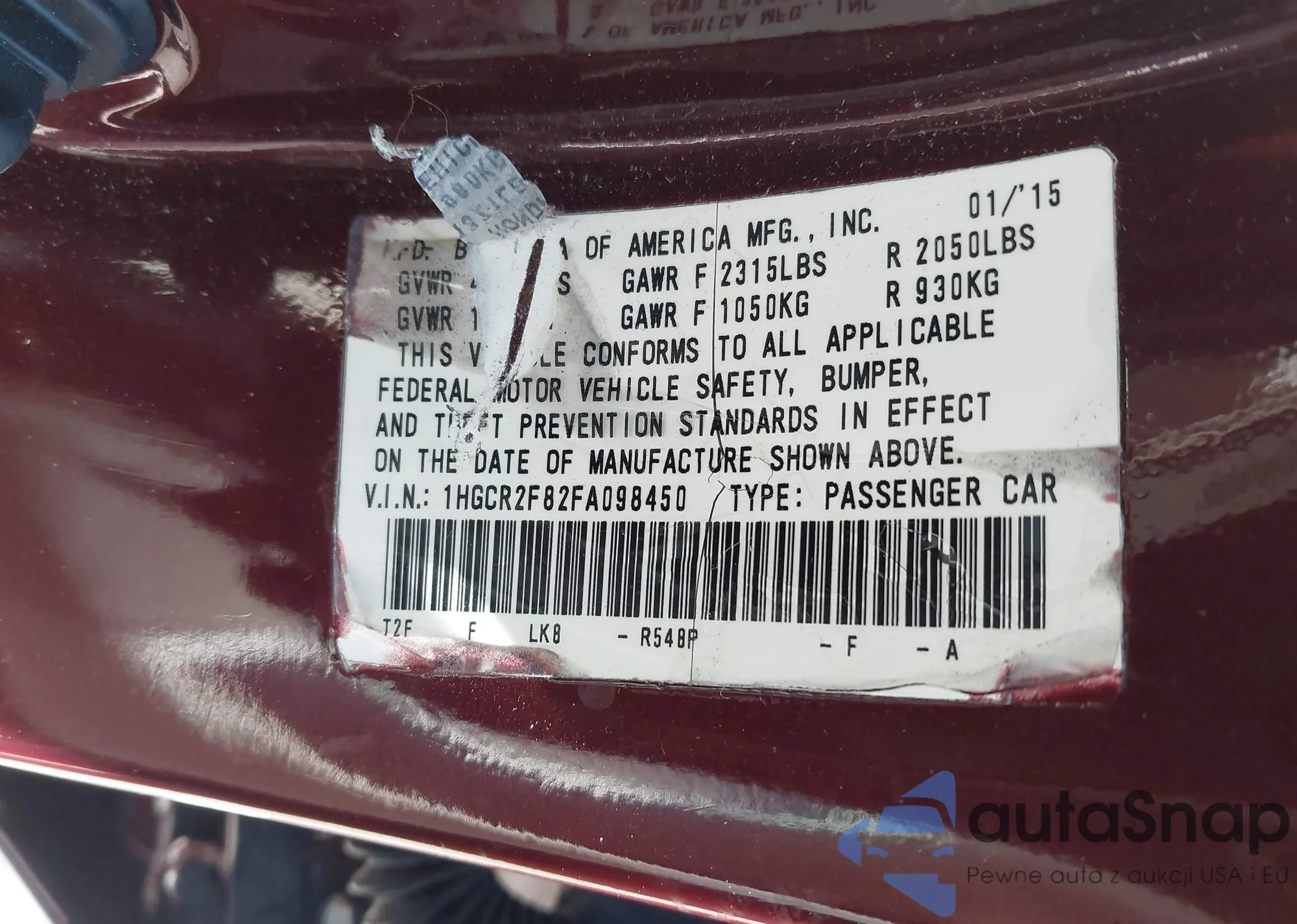 LOT: 42783697 VIN: 1HGCR2F82FA098450