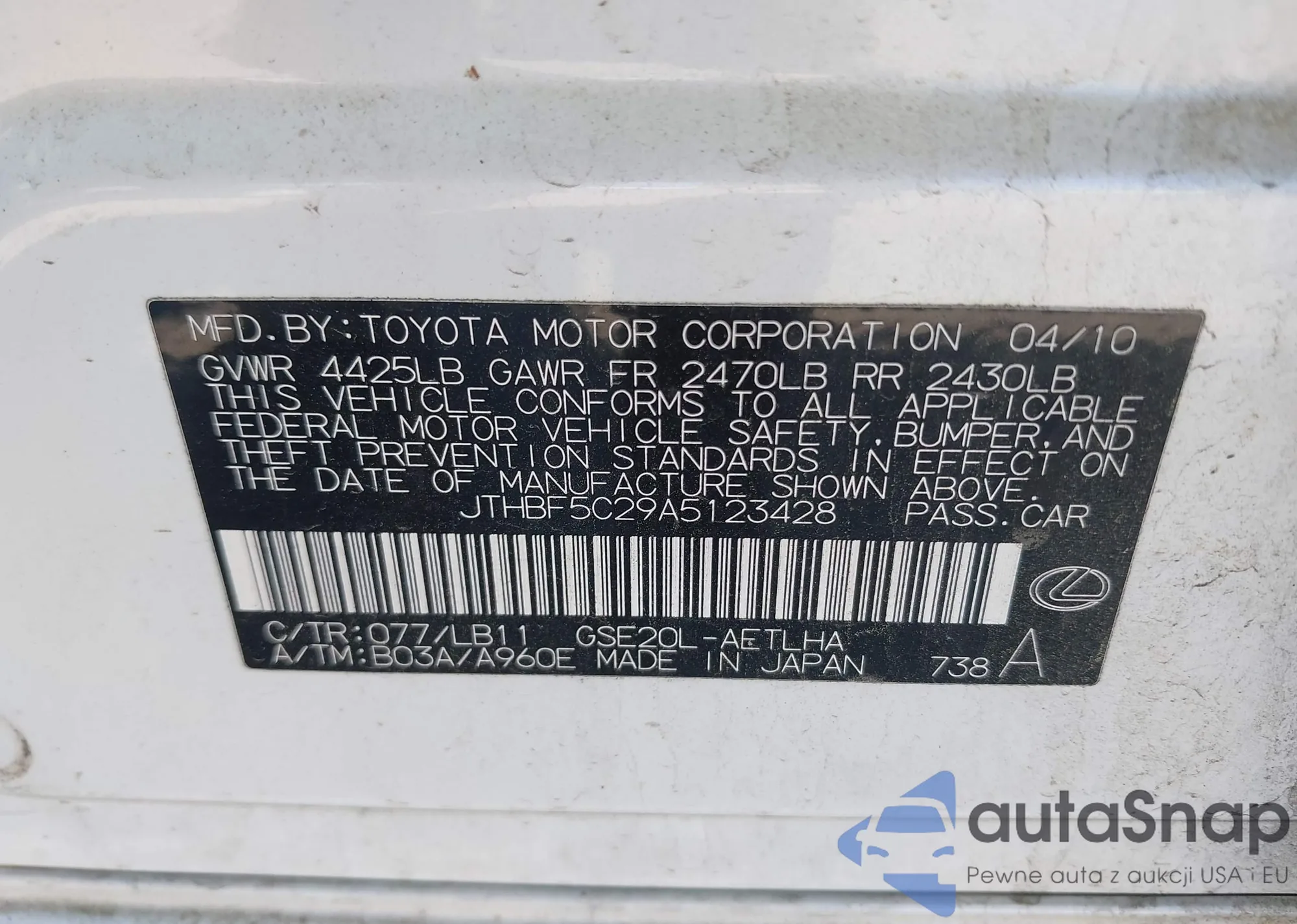 LOT: 42167042 VIN: JTHBF5C29A5123428
