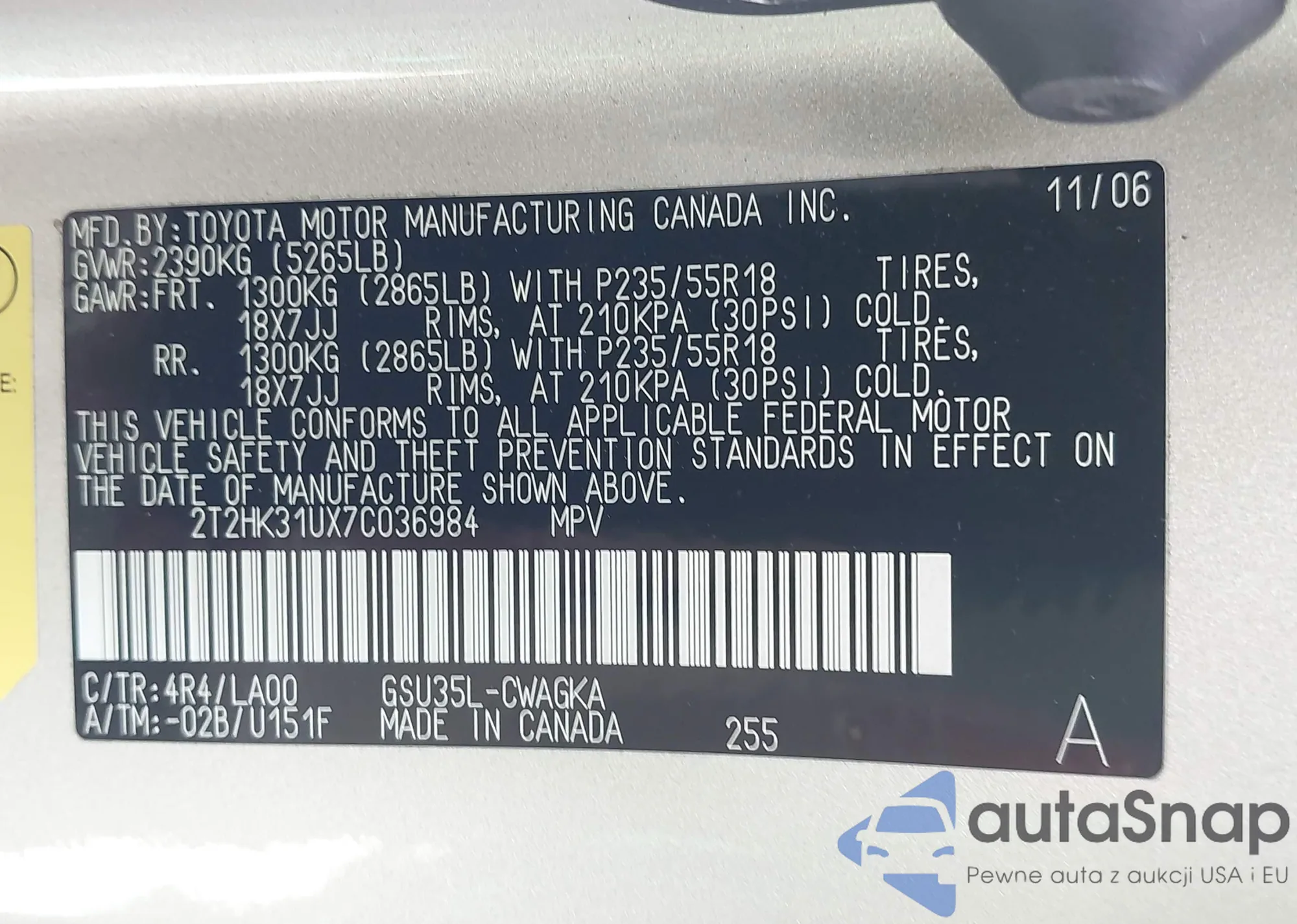 LOT: 42996326 VIN: 2T2HK31UX7C036984