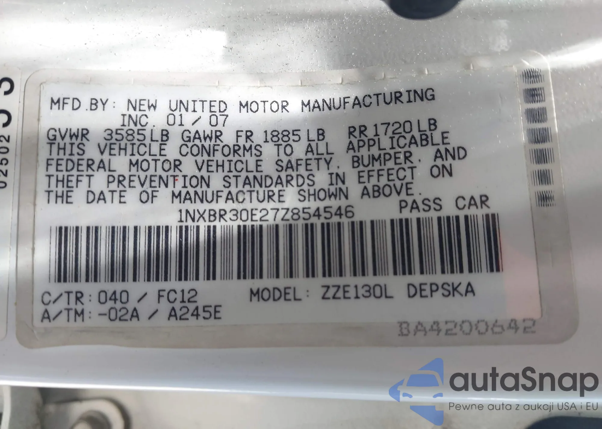 LOT: 42666748 VIN: 1NXBR30E27Z854546