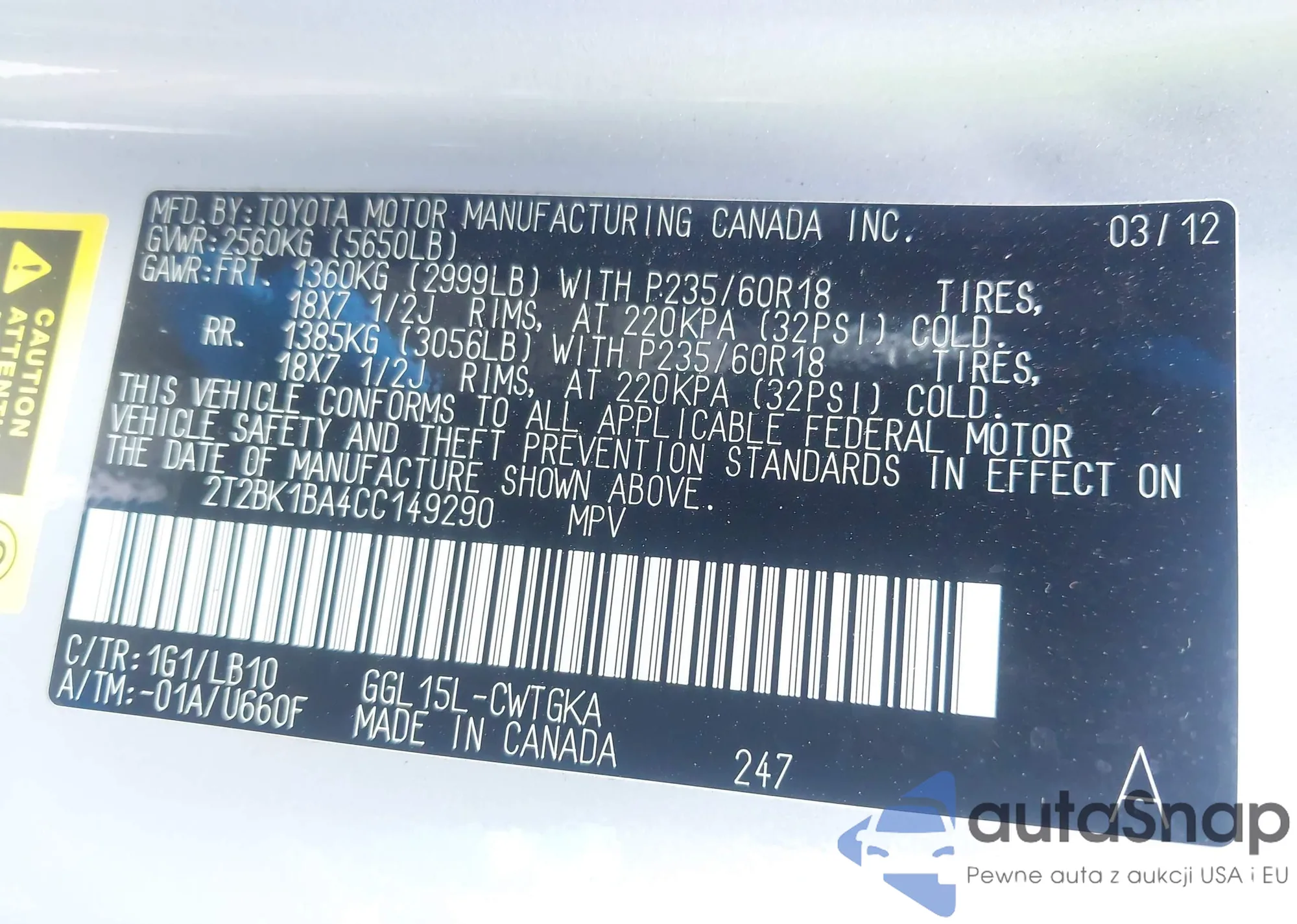 • VIN 2T2BK1BA4CC149290