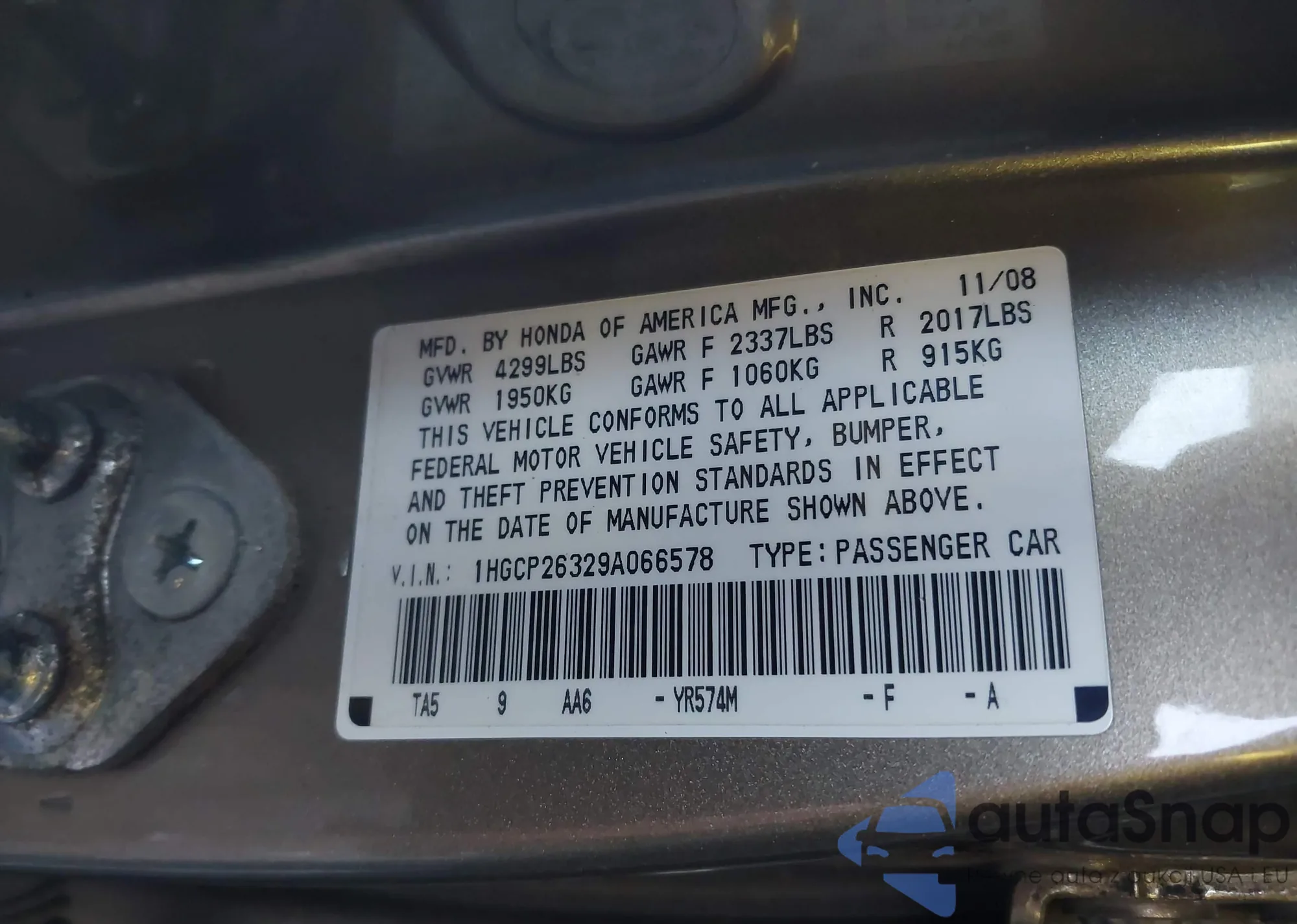 LOT: 40967710 VIN: 1HGCP26329A066578