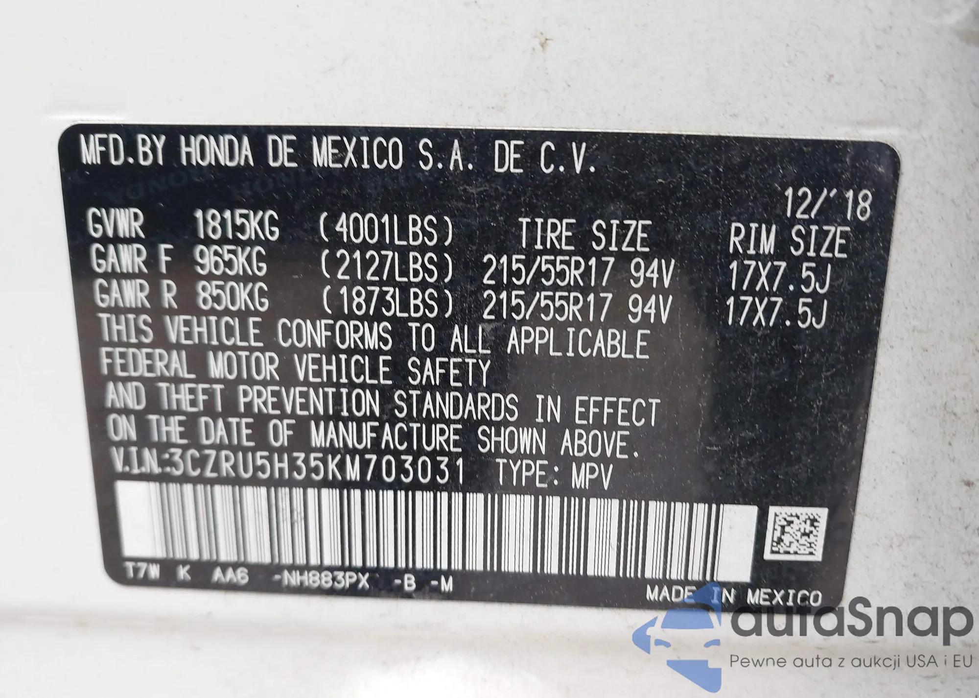 • VIN 5FNRL5H69CB128179