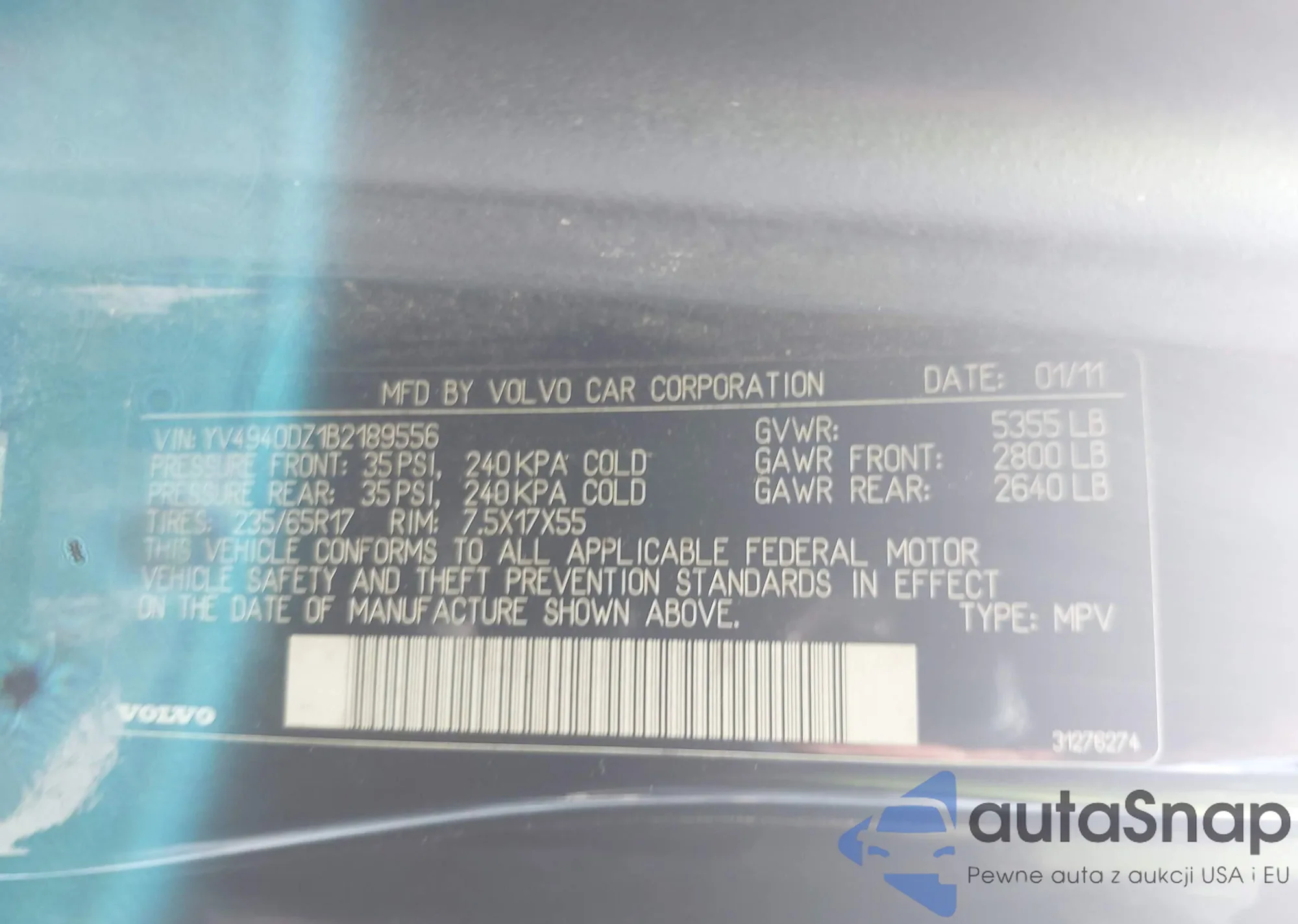 LOT: 42869746 VIN: YV4940DZ1B2189556