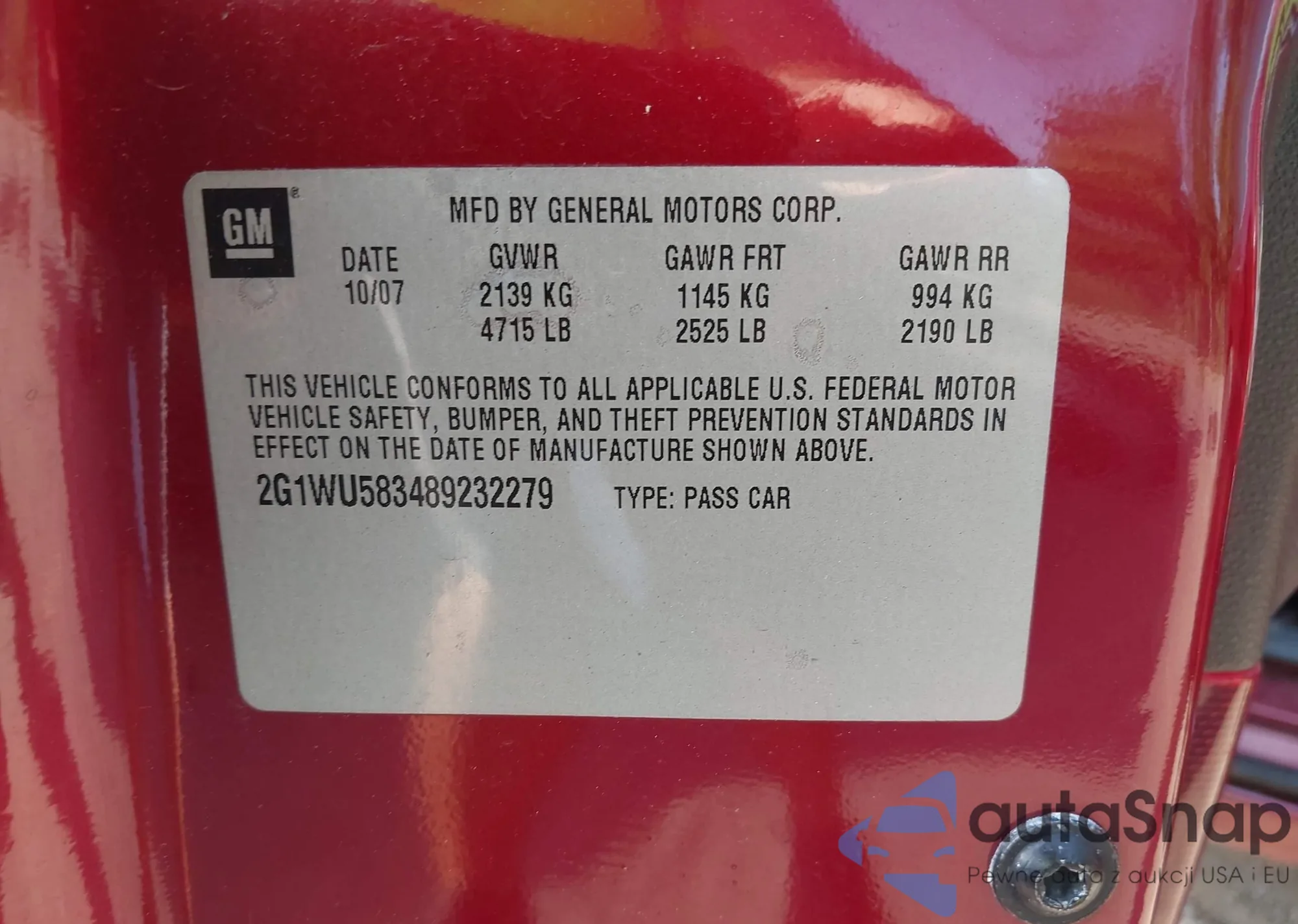• VIN 2G1WU583489232279