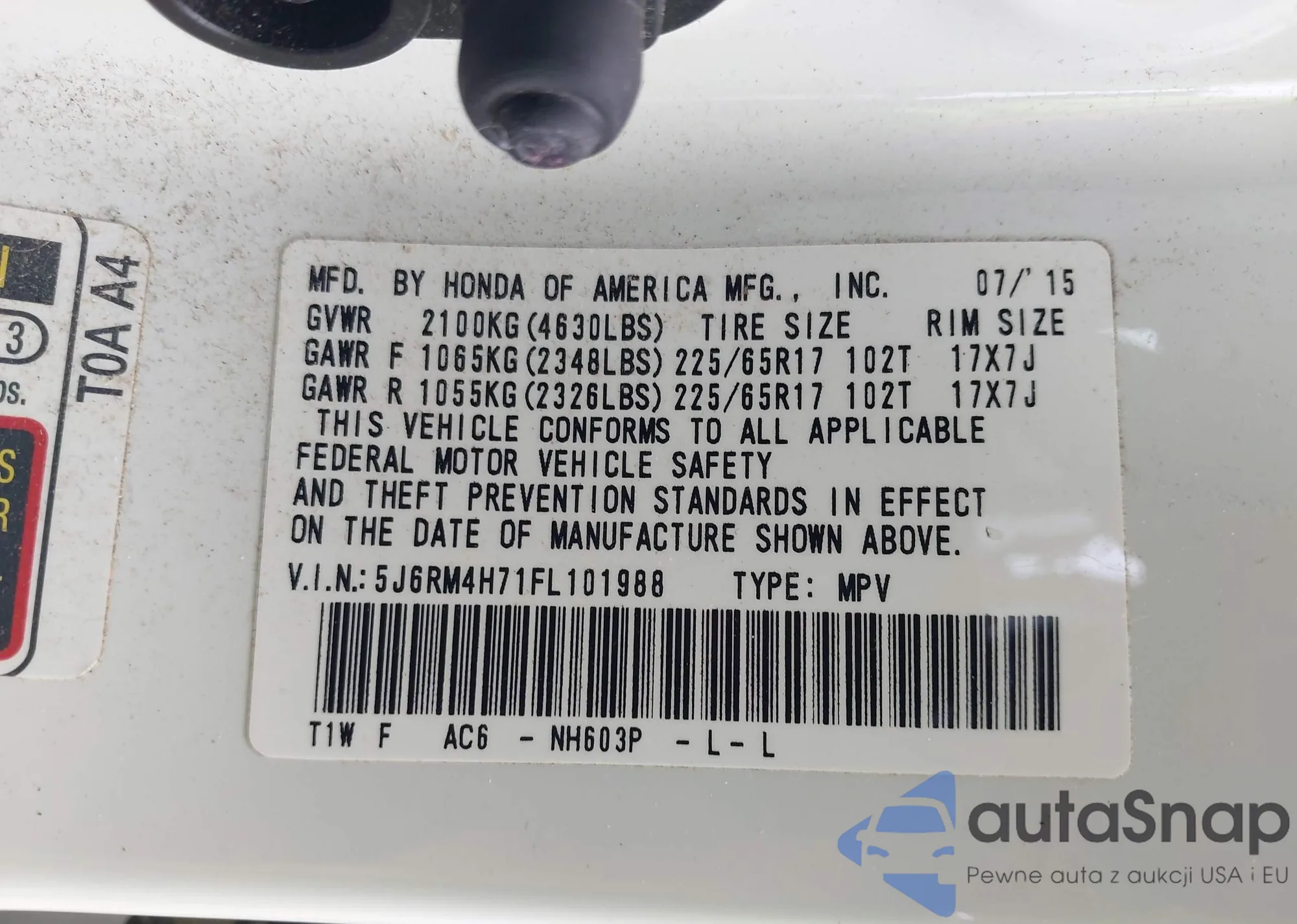 • VIN 5J6RM4H71FL101988