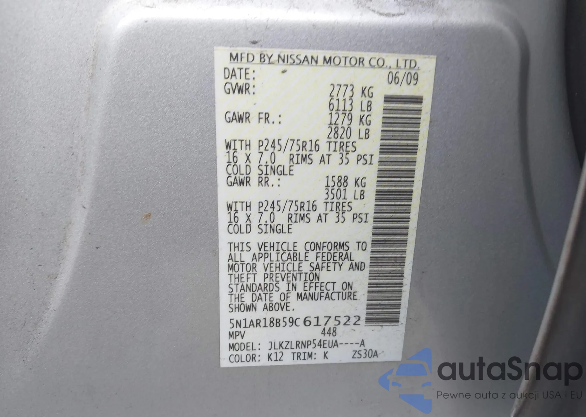LOT: 42951295 VIN: 5N1AR18B59C617522