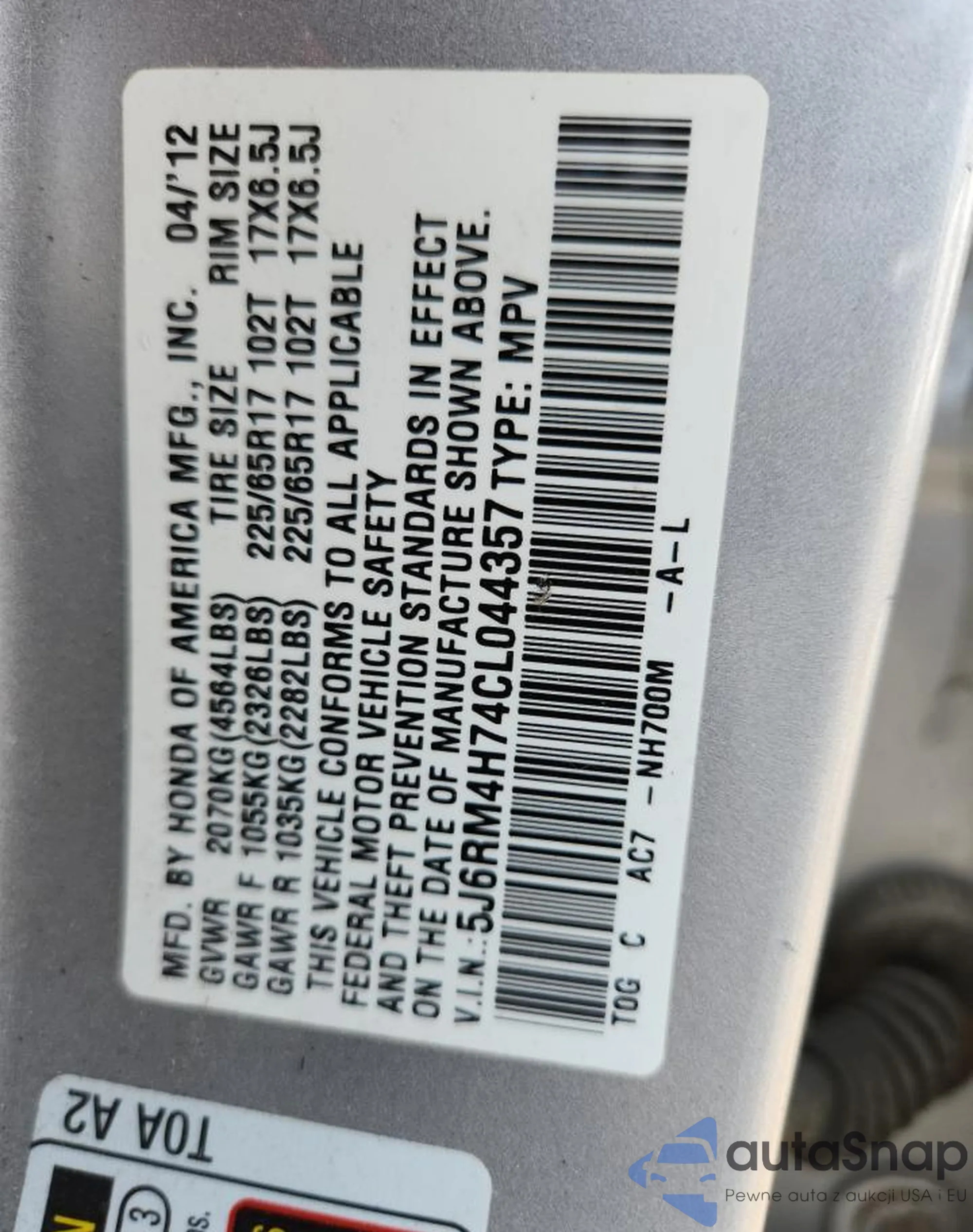 • VIN 5J6RM4H74CL044357