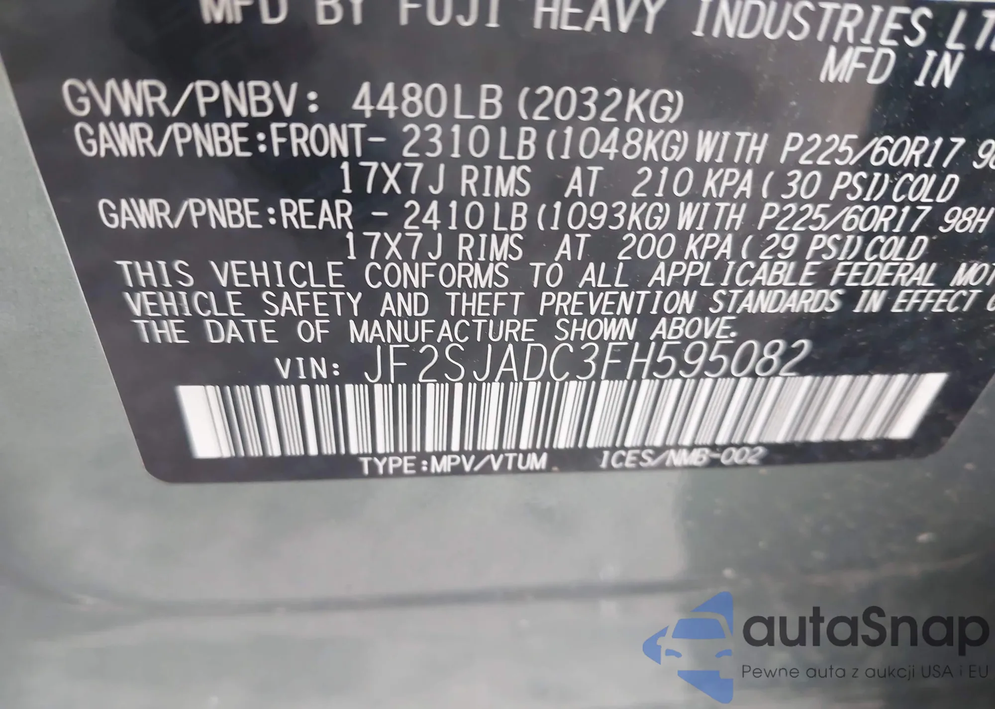 LOT: 42908871 VIN: JF2SJADC3FH595082