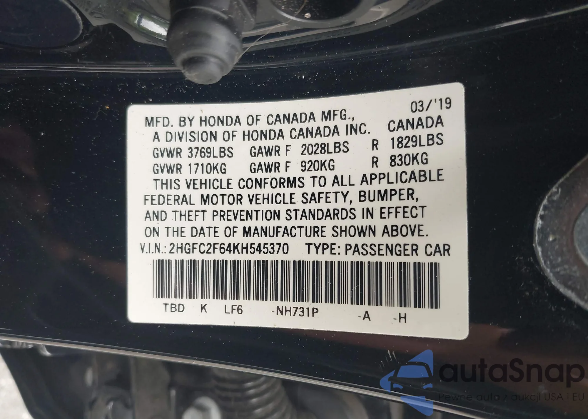 • VIN 2HGFC2F64KH545370