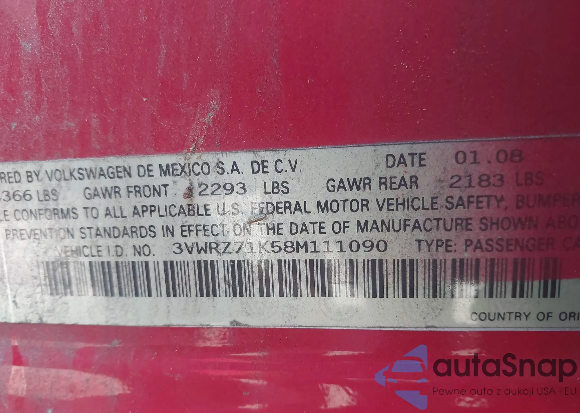 • VIN 3VWRZ71K58M111090
