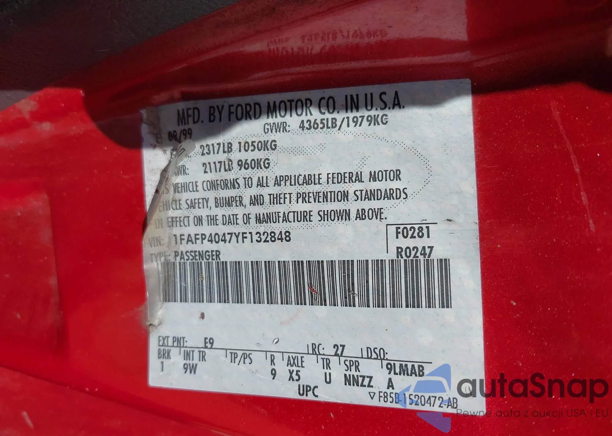 LOT: 42611559 VIN: 1FAFP4047YF132848