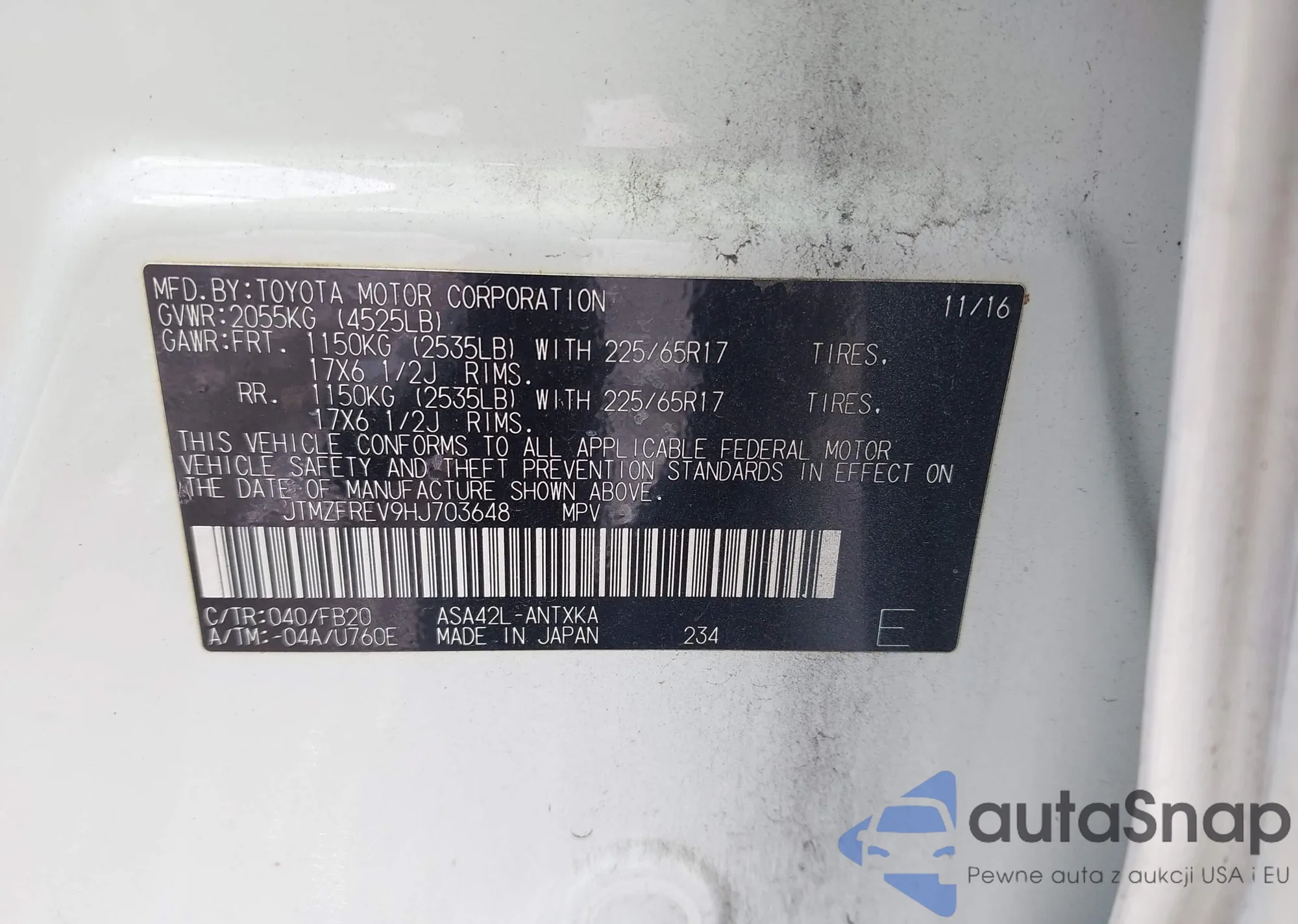 LOT: 42826627 VIN: JTMZFREV9HJ703648