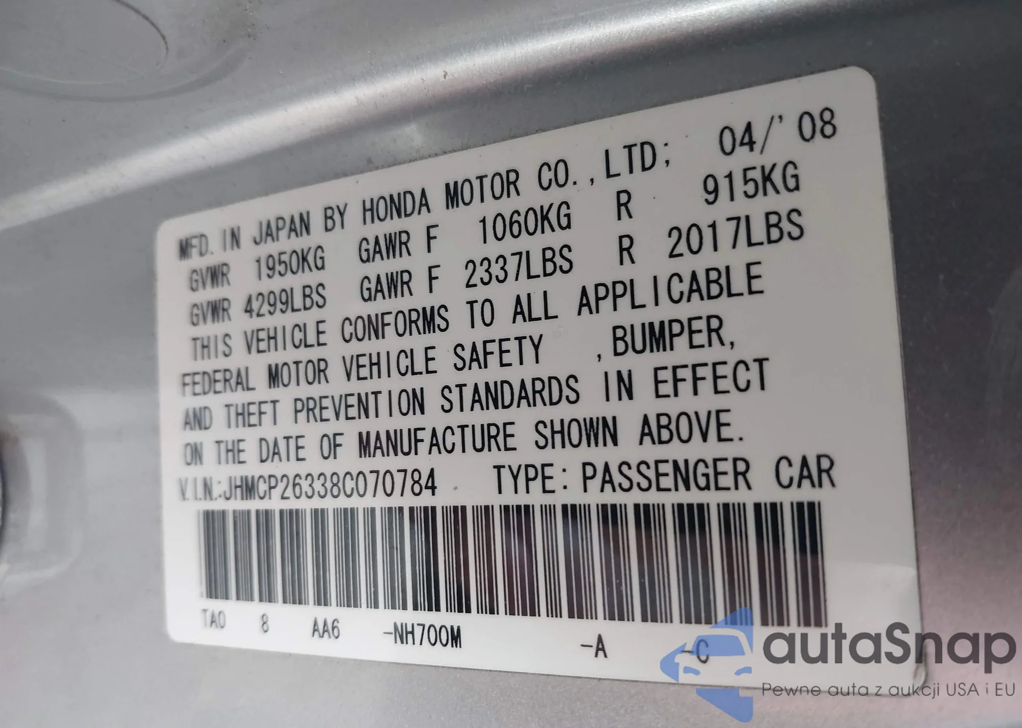 LOT: 42932084 VIN: JHMCP26338C070784