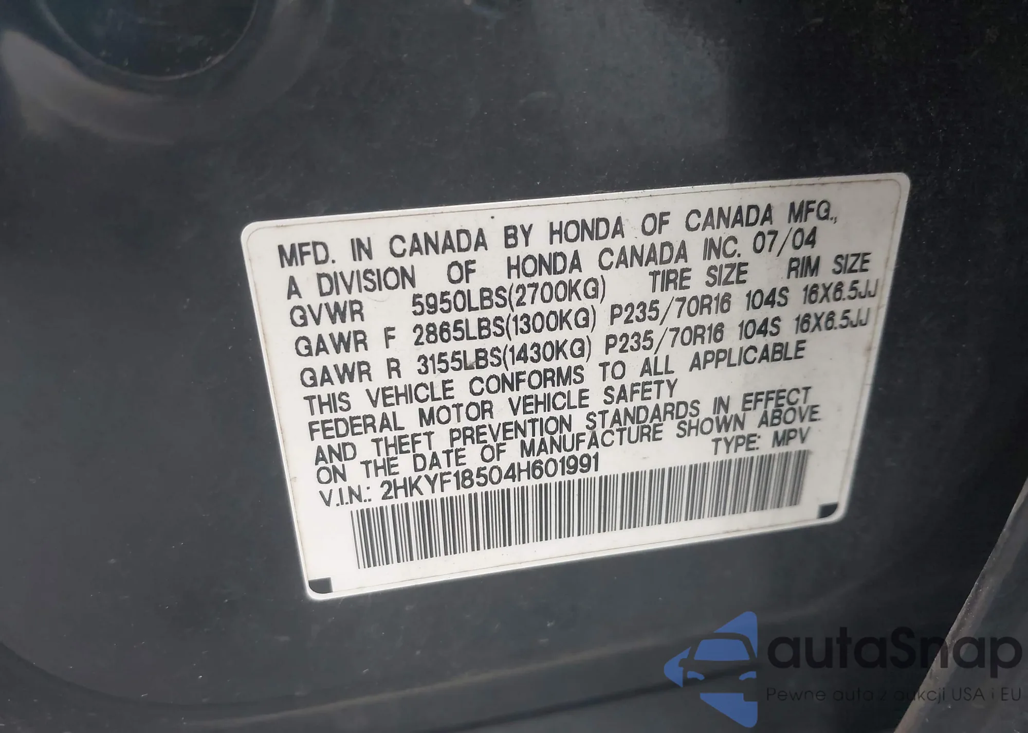 • VIN 2HKYF18504H601991