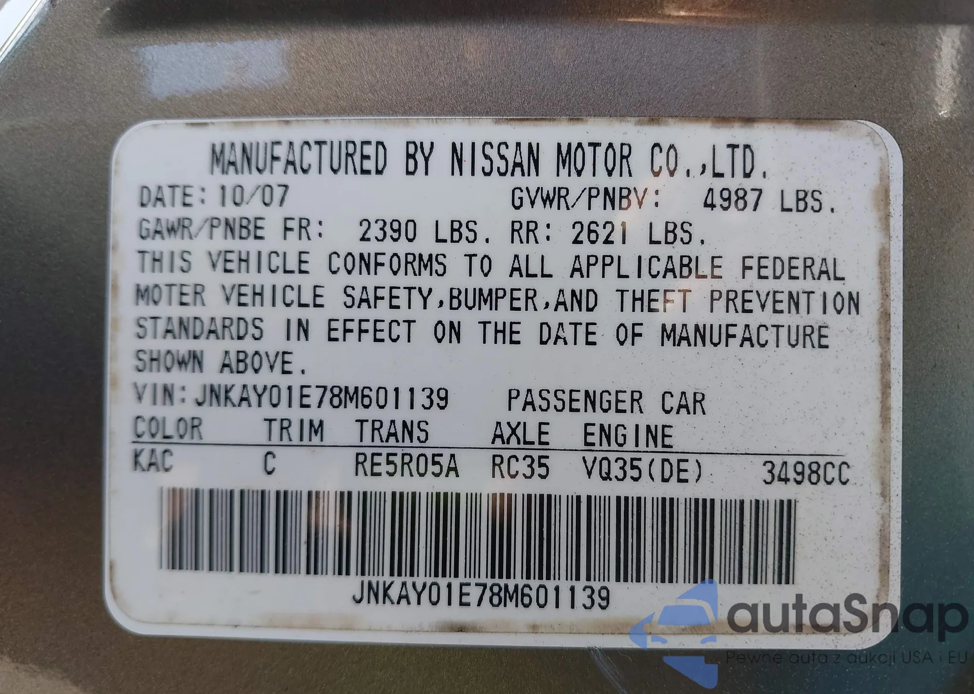 • VIN JNKAY01E78M601139
