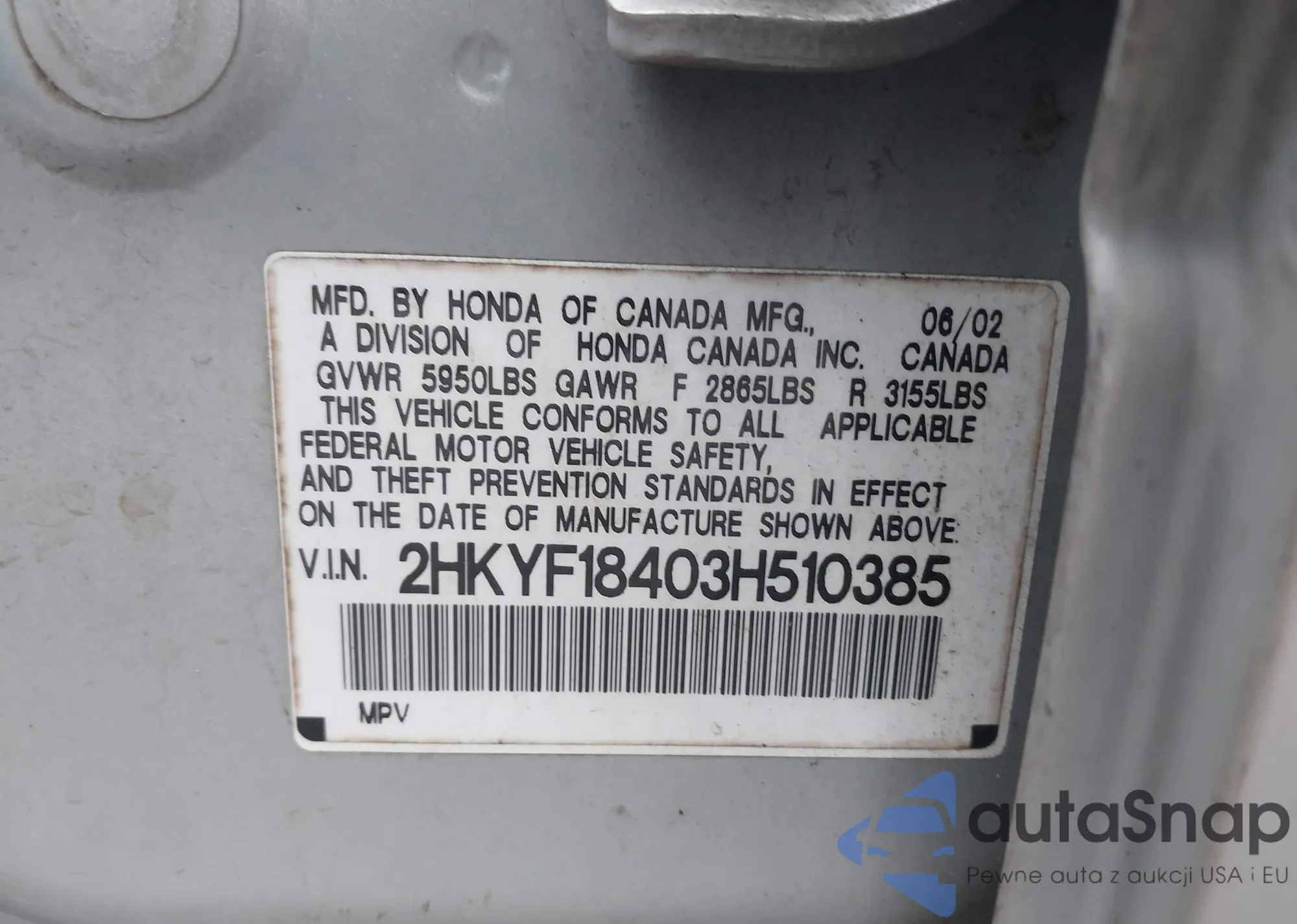 LOT: 42898935 VIN: 2HKYF18403H510385