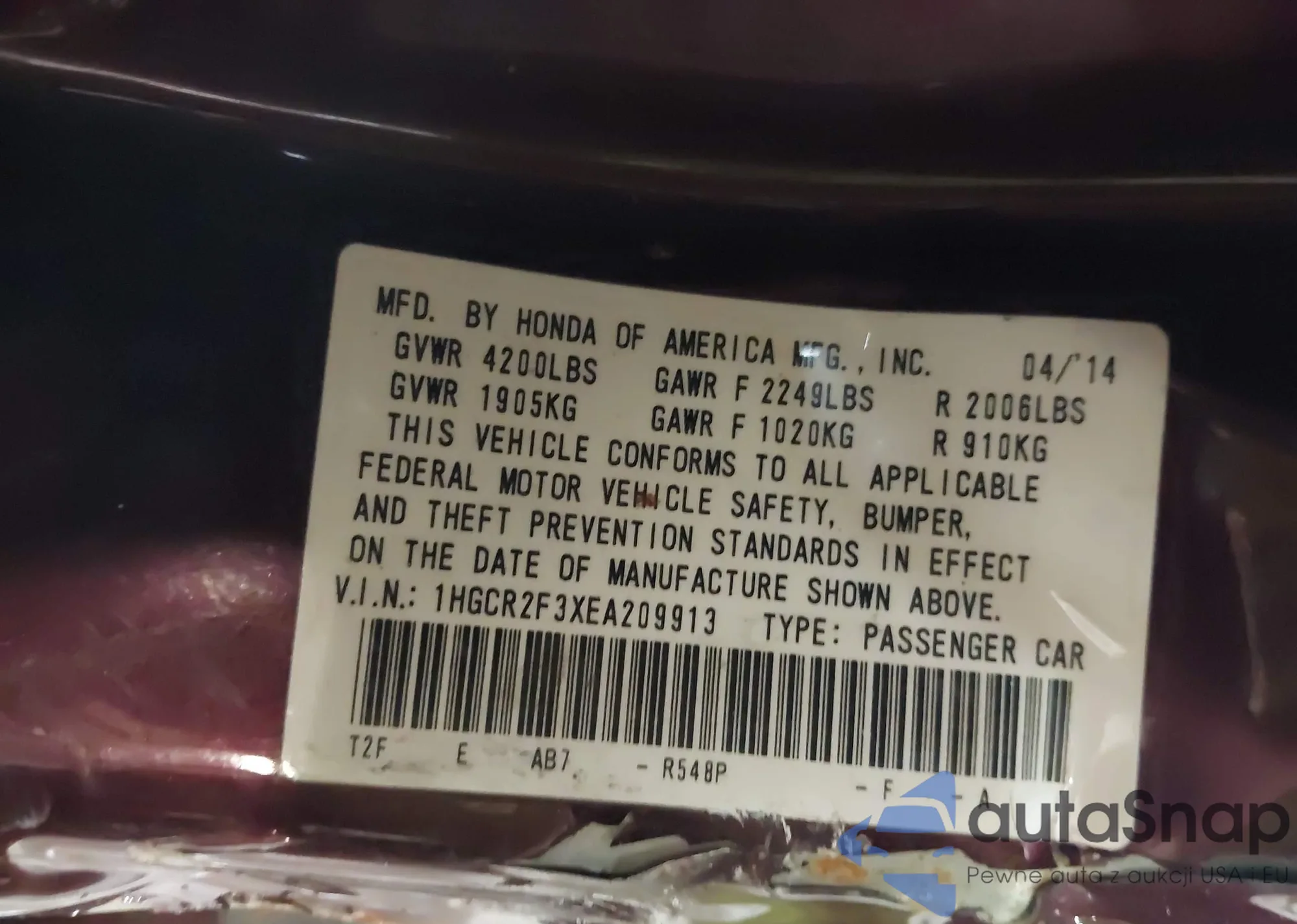 LOT: 39223033 VIN: 1HGCR2F3XEA209913