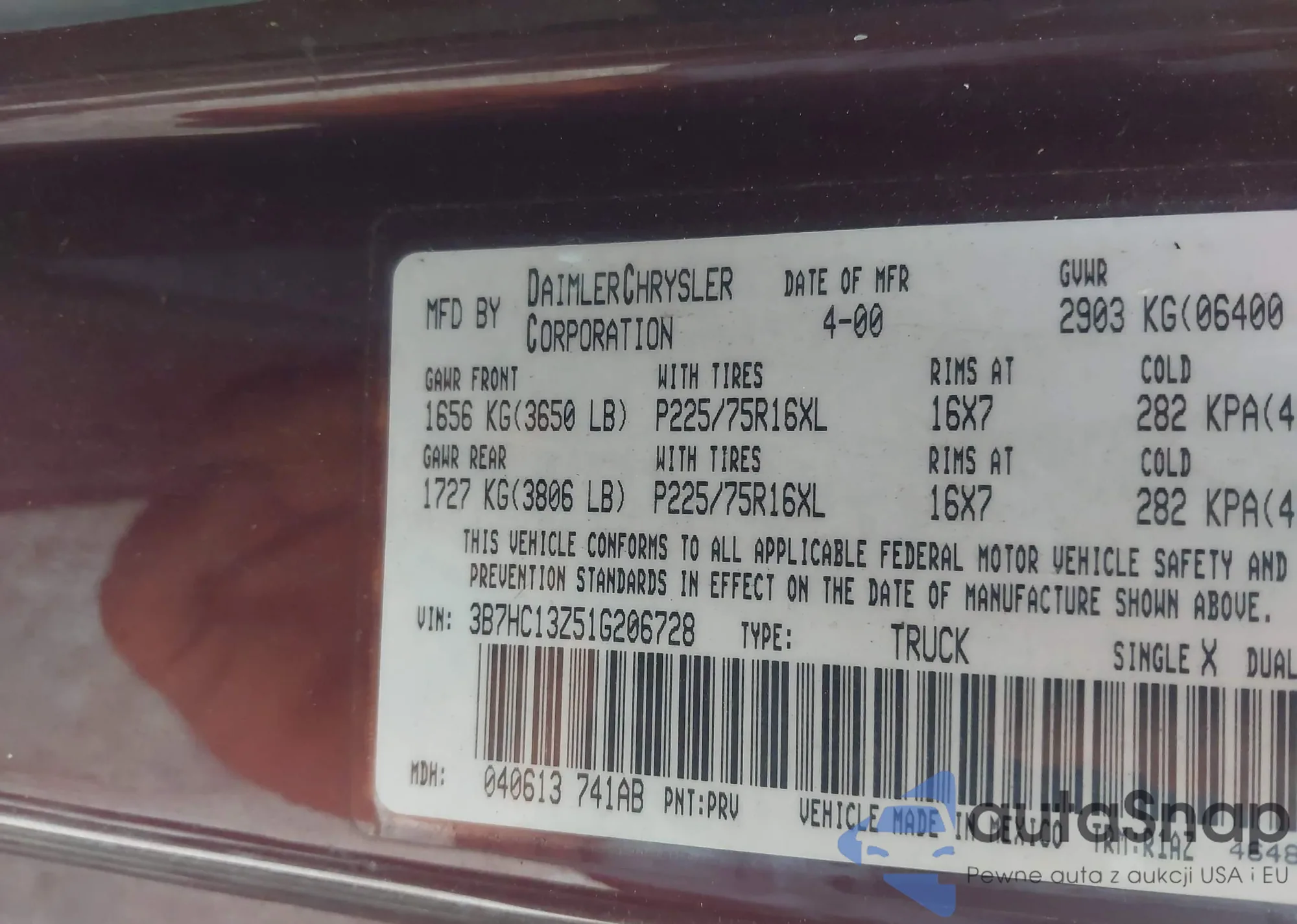 • VIN 3B7HC13Z51G206728