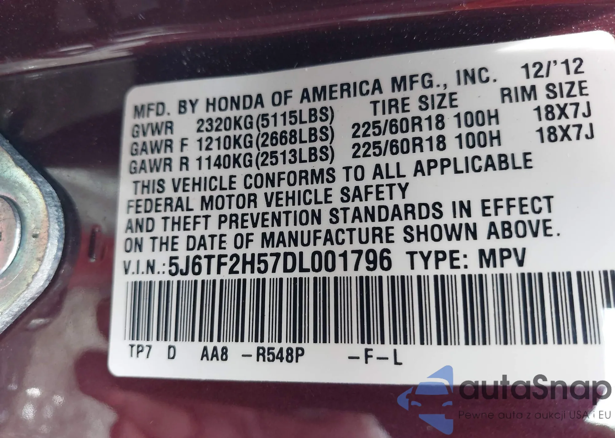 • VIN 5J6TF2H57DL001796