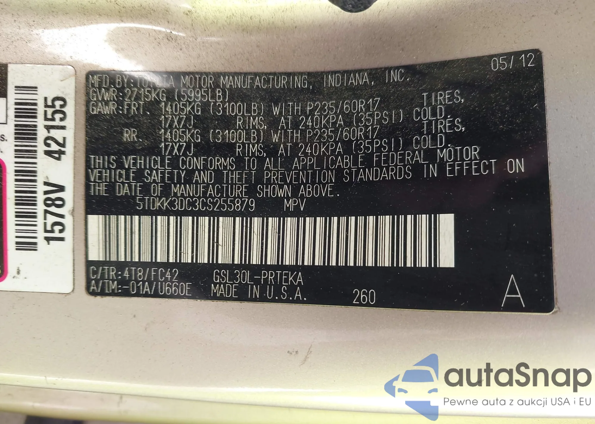 LOT: 42696198 VIN: 4T1BF3EK5BU701322